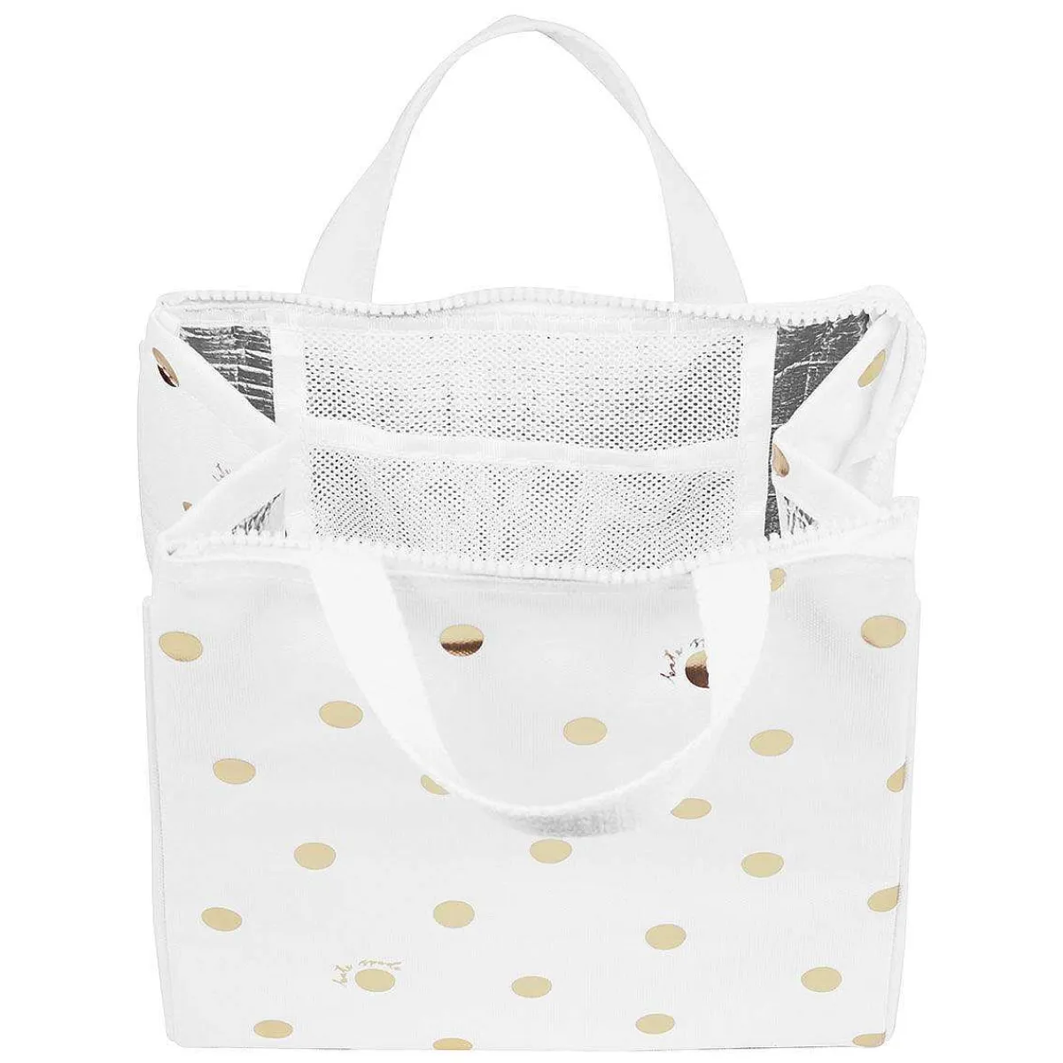 The Lunch Bag Is Decorated In A Repeat Shimmering Gold Dot Design Across The Cover. Some Of The Dots Have A Handwritten Script Around Them Which Reads ‘Kate Spade’. The Kate Spade Logo Is Also Printed On The Front Of The Bag In Gold Foiling To Give A Luxurious Feel To The Design. At The Top Of The Bag Are Two Carry Handles And Securing The Bag Is A White Zip With A Matching Zip Pull. Inside Is A Silver Insulated Lining To Keep Your Food Cold And A Mesh Pocket To Store Anything You Want Easy Access Too.