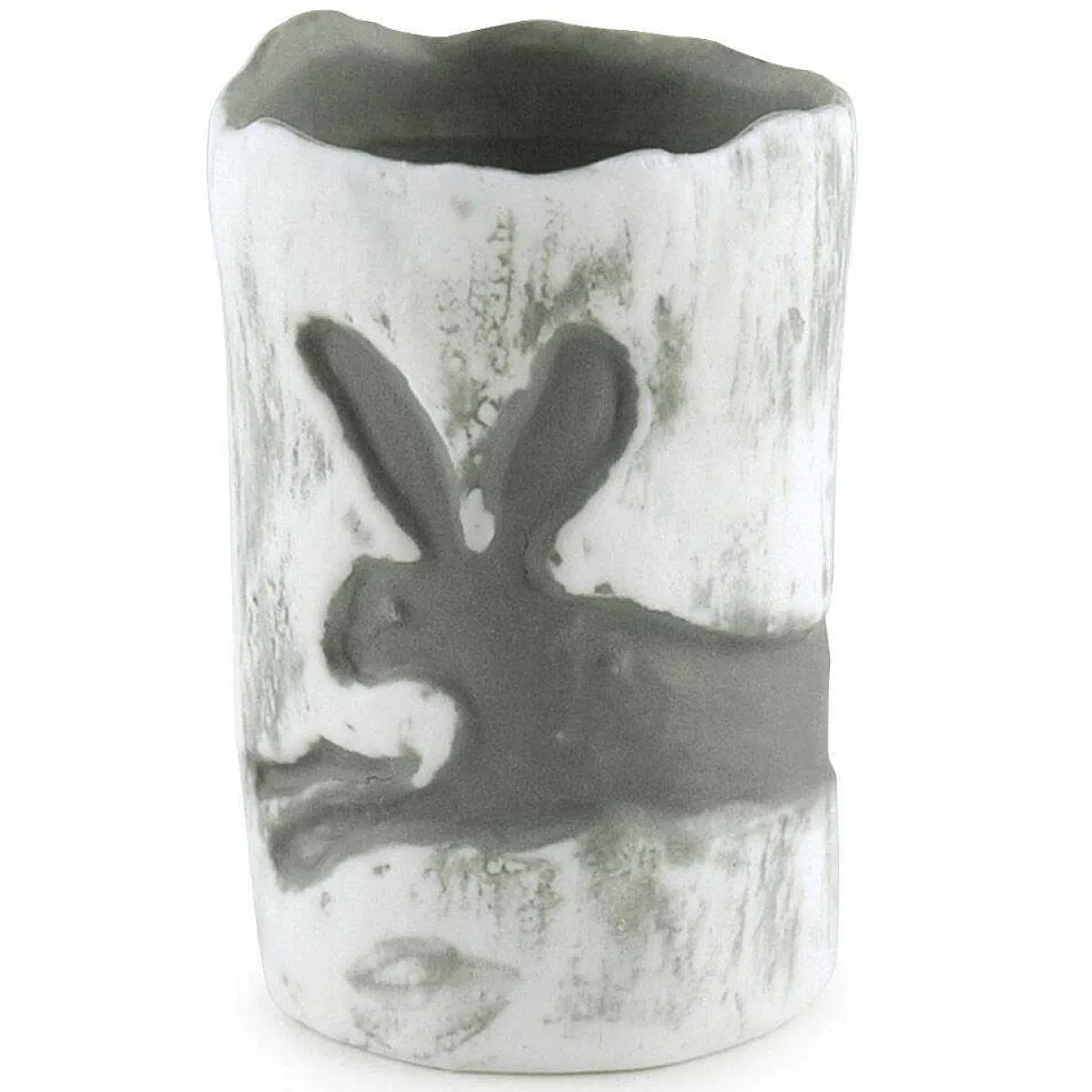 Made From Ceramics, This Vase Is Rustic And Misshapen On The Rim. With Rough White Brushstrokes, The Vase Is Complete With A Joyful Running Rabbit Engraved Onto The Side.