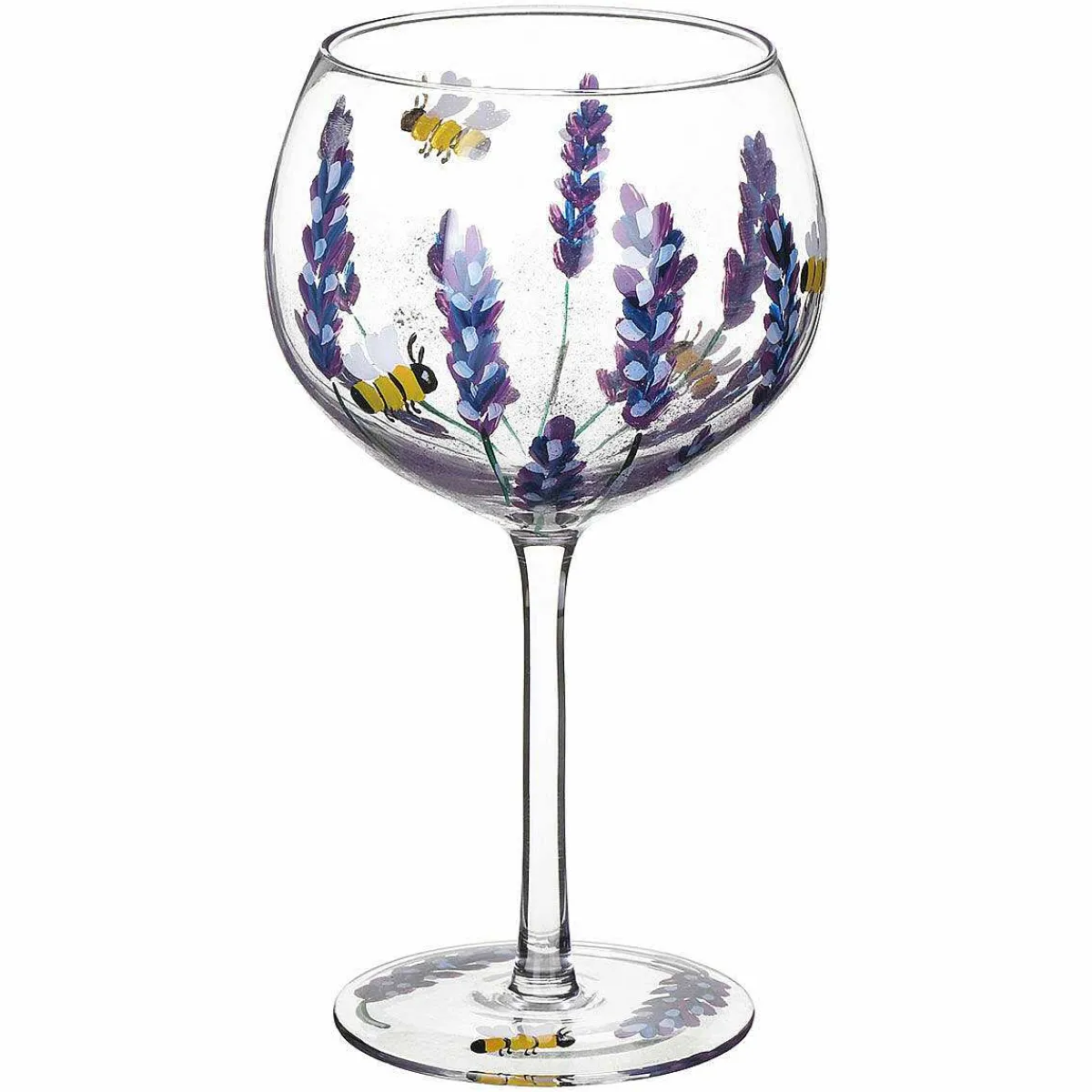 This Balloon Gin Glass Features A Rounded, Bulbous Bowl And A Long Stem. Adorning The Bowl Of This Magnificent Gin Glass Is A Plethora Of Lavender Flowers In Shades Of Purple And Blue. Fluttering Around The Flowers Are Adorable Little Bumblebees Which Add That Extra Pop Of Colour To The Design. The Gorgeous Floral Motif Continues Across The Base Of The Glass.