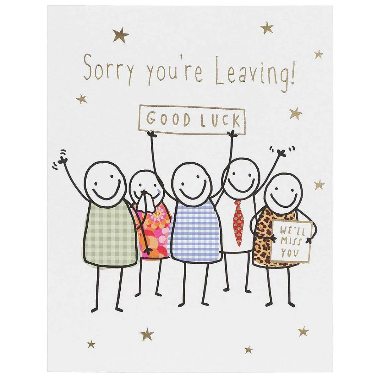 The Card Features Illustrations Of People Stood Together Waving Goodbye, The Middle Person Is Holding A Sign That Reads ‘Good Luck’, And Another Holds A Sign That Reads ‘We’Ll Miss You’. There Are Small Golden Stars And Text Which Reads ‘Sorry You’Re Leaving!’ Set Against A White Background.