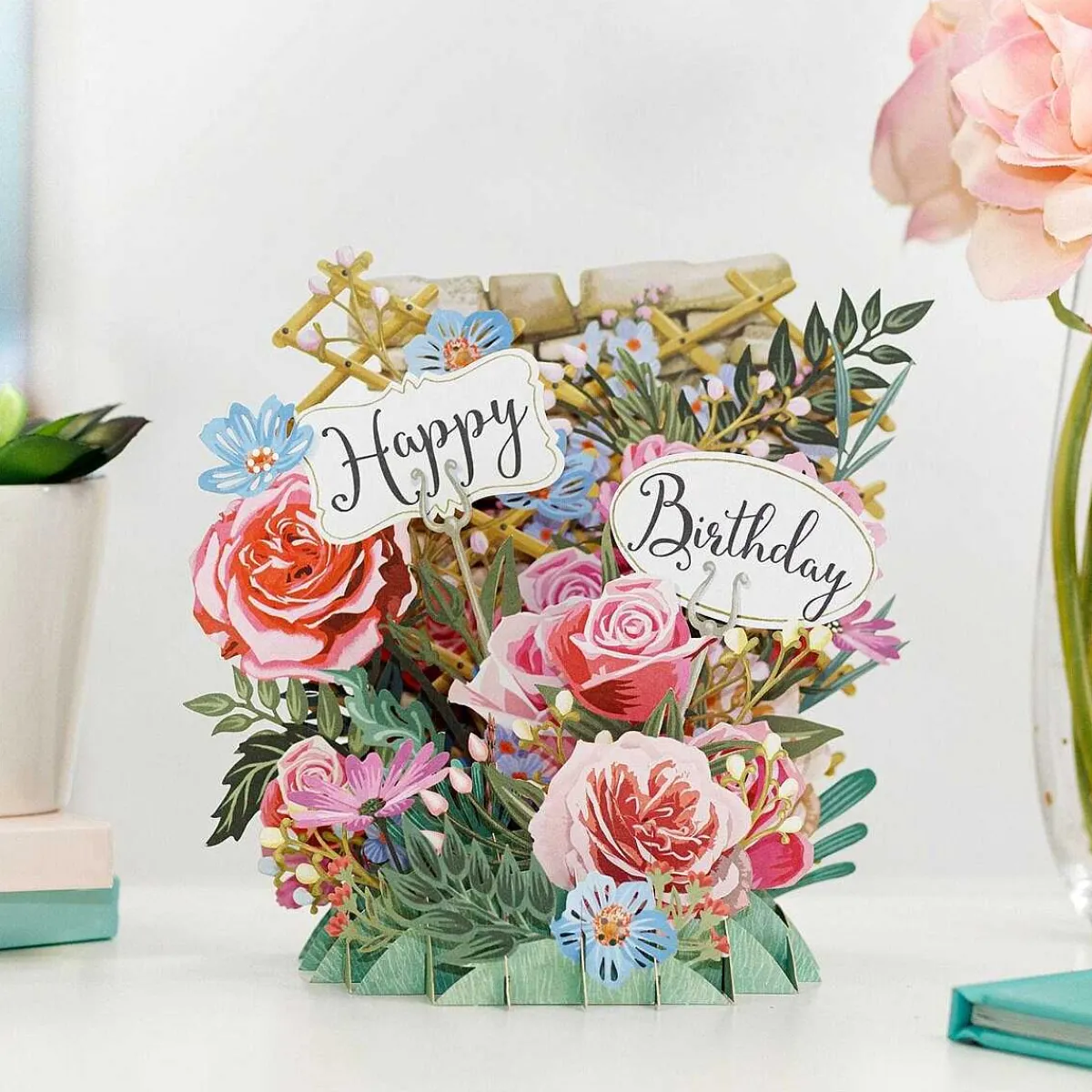 A Beautiful Bouquet Of Flowers Is Depicted In Three-Dimensional Form On This Lovely Pop-Up Birthday Card. Pink Roses And Other Colourful Flowers, Some In Bud, Others Fully Flowering, Are Intertwined With Green Foliage Against An Old Garden Wall And Amongst Them Two Cards Can Be Seen Printed With The Words: Happy Birthday. A Blank Space Is Provided On The Back For Your Message.