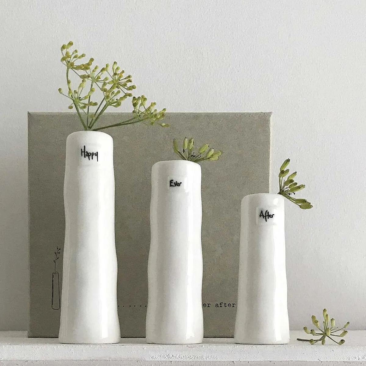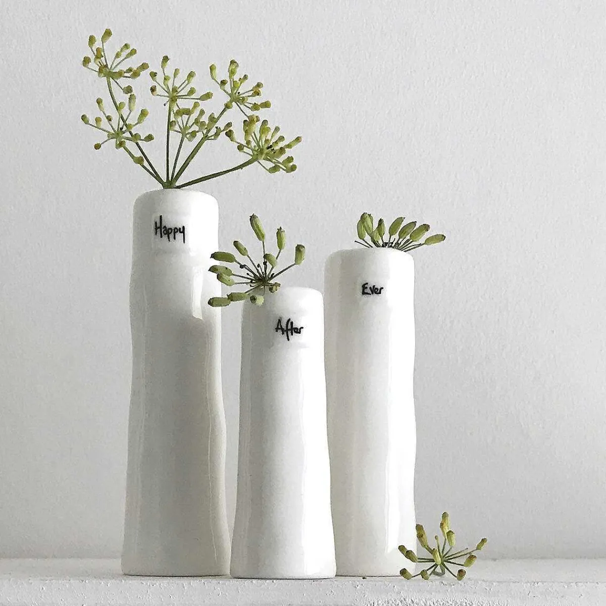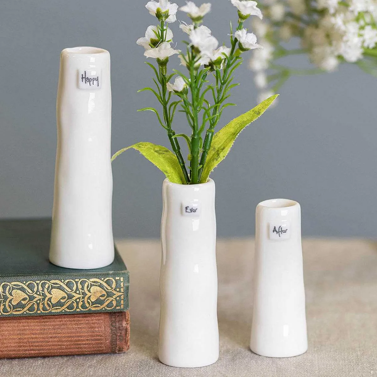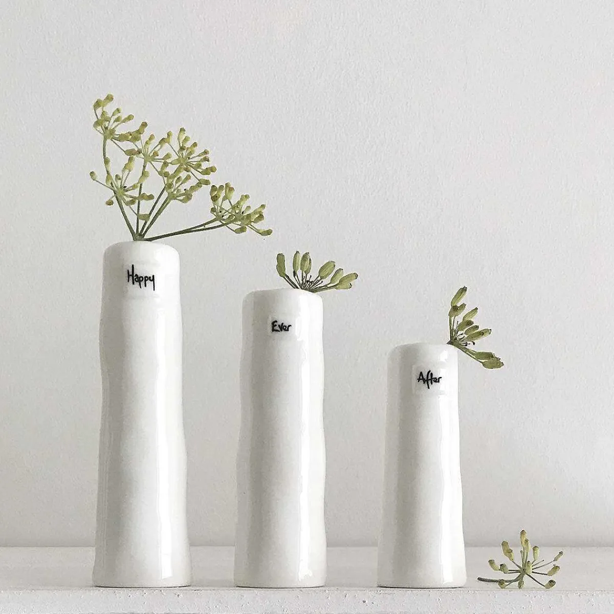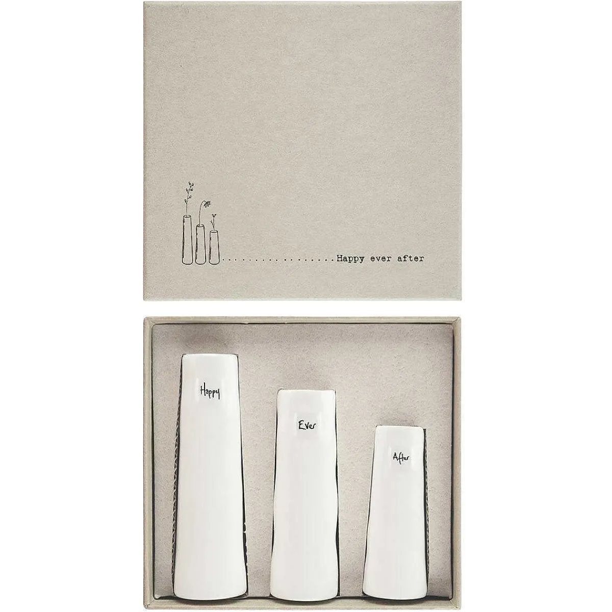 Three Vases Are Different Heights And Designed With Three Different Words Which Are, The Tallest Vase Reads ‘Happy’, The Middle Vase Reads ‘Ever’ And The Shortest Vase Reads ‘After’. The Vases Have An Artisan Feel To It And Would Be Perfect To Use As Pretty Flower Vases For A Kitchen, Bedroom Or Table Setting.