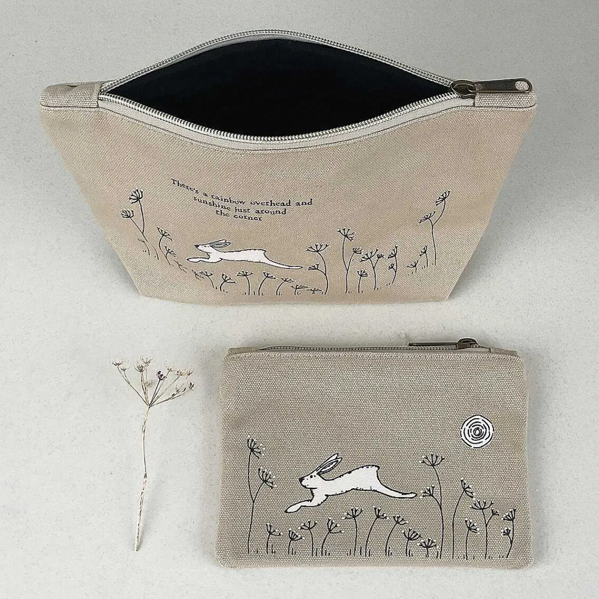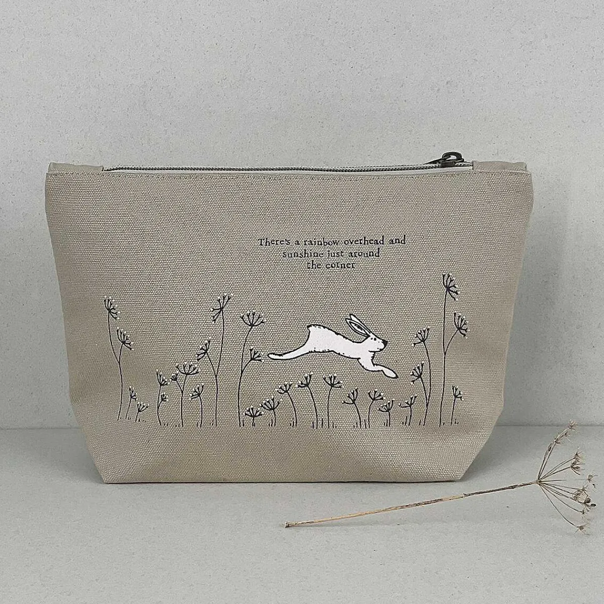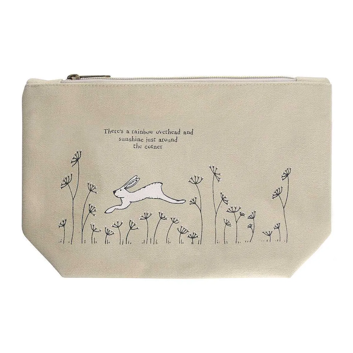 Made From Linen, This Cosmetic Bag Is A Light Brown Colour, And It Is Decorated With A Design Of A White Hare And Embroidered Flowers. There Is Black Stitches Which Read ‘There’S A Rainbow Overhead And Sunshine Just Around The Corner’. This Wonderfully Stylish Makeup Pouch Is Secured With A Bronze Zip.