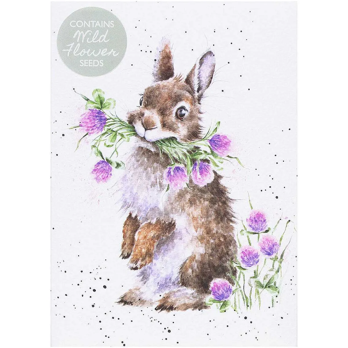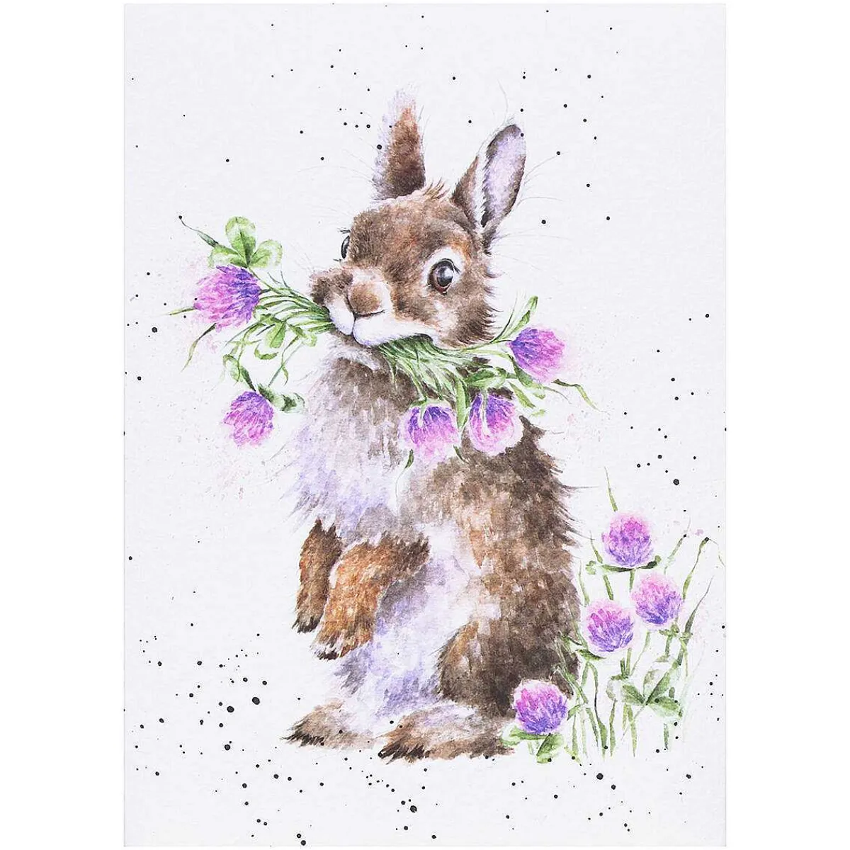 This Illustration On The Front Of This Card Features A Fluffy Bunny Who Is Sat Up On His Hind Paws, His Mouth Full Of Purple Clover Flowers. The Bunny Covered In Gorgeous Fur With White And Brown Colourings Which Contrast Beautifully With The Luscious Greens And Purples Of The Flowers. The Bunny Is Painted In The Soft Watercolour Style Of Artist Hannah Dale, Depicted With Intricate Detail And Surrounding The Illustration Are Speckles Of Black Paint, In A Way That Is Synonymous With The Wrendale Brand.