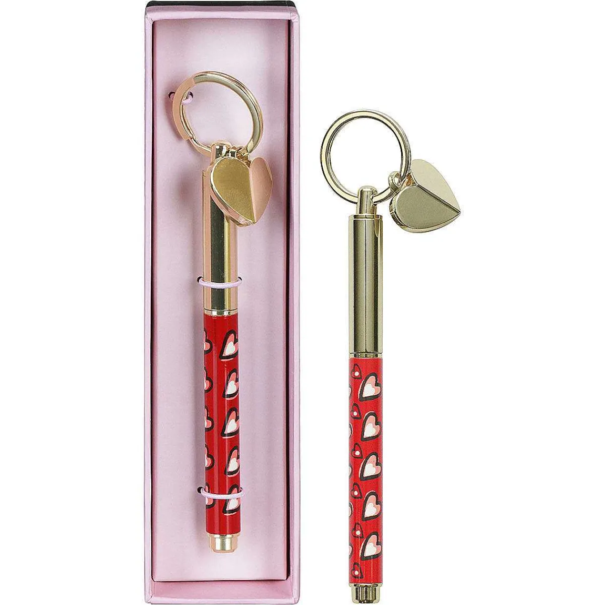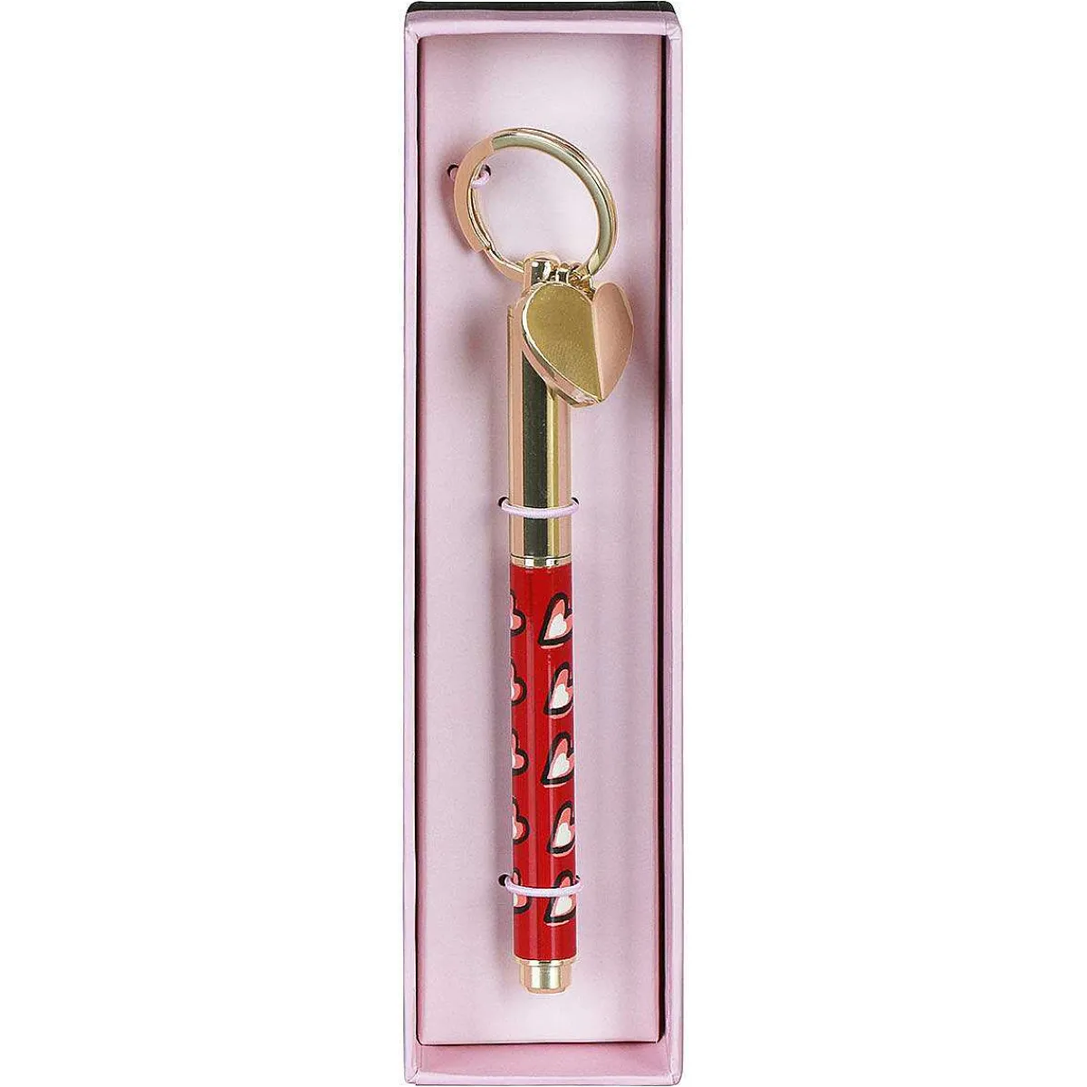 The Pen Is Designed With The ‘Hearts’ Theme Around The Body Of The Pen And Finished With A Gold Lid And Base. This Pen Writes With Black Ink Making It Perfect For Filling Out Documents And Forms. This Stylish Pen Is Branded With The Kate Spade Logo And A Golden Heart Charm Attached To The Keyring This Key Fob Pen Oozes Luxury.