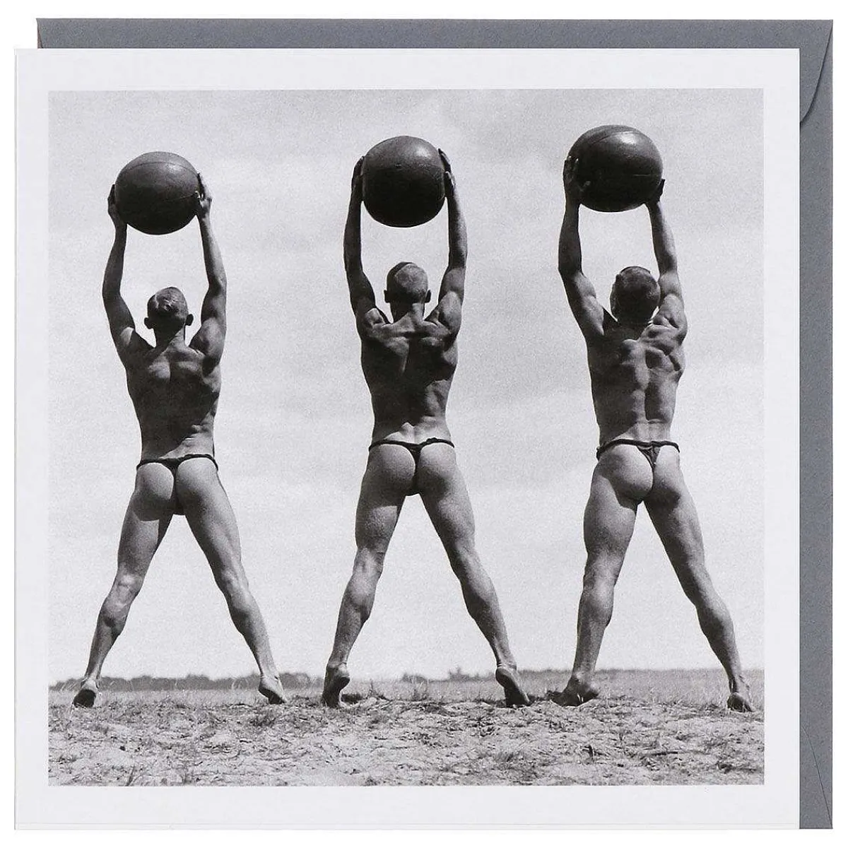 This Black And White Card Features Three Men Lifting Medicine Balls Above The Heads Whilst Wearing Revealing Underwear!