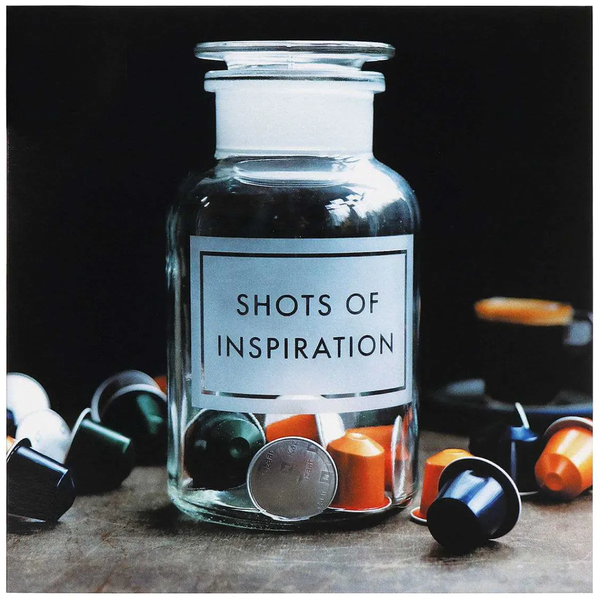 The Card Features A Small Jar With A Variety Of Coffee Pods Scattered In And Around The Jar. The Jar Has Text Printed On Which Reads ‘Shots Of Inspiration’.