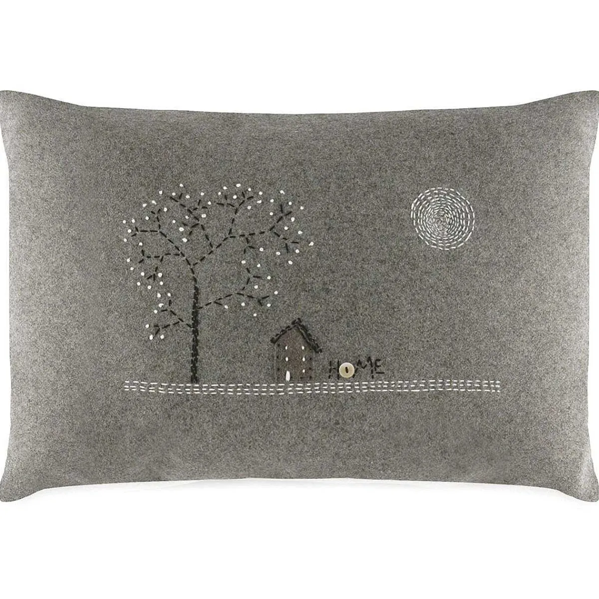 This Handmade Cushion Is Rectangular In Shape, Feather Filled And Made From Wool. Dark Grey In Colour, This Cushion Features White And Black Stitching On The Front With An Image Of A Tree And House. It Is Ideal For Displaying Around Your Home.