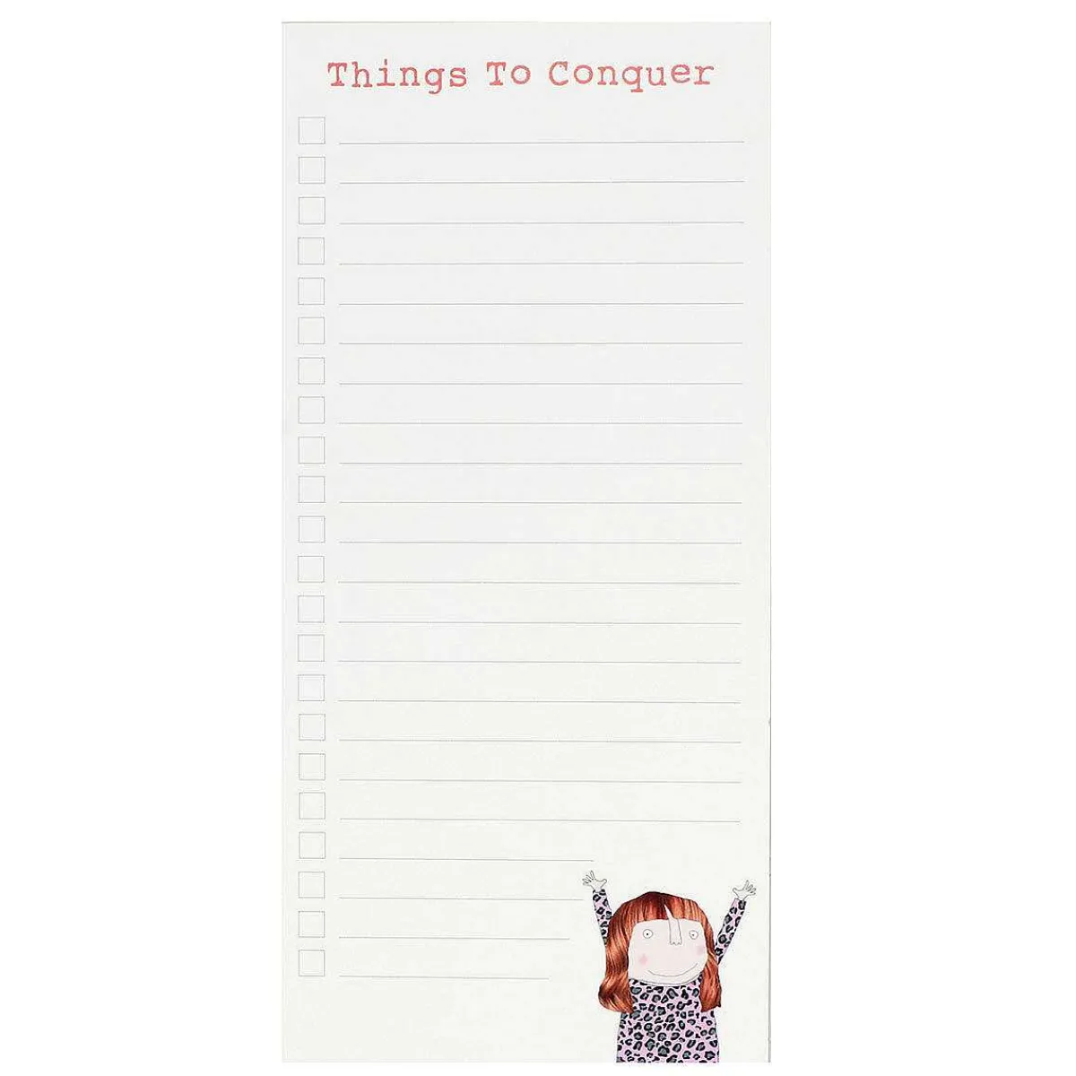 Inside The List Pad Each Page Has The Title Across The Top Which Reads ‘Things To Conquer’. The Page Features Ruled Lines With A Box At The Beginning Allowing You To Tick Things Off As You Complete Them. There Is Also A Mini-Illustration At The Bottom Of The Page Of The Lady Cheerily Holding Her Arms In The Air! On The Reverse Of This Fun Notepad Is A Magnetic Strip On The Back Perfect For You To Attach To Your Fridge For Easy Reference.
