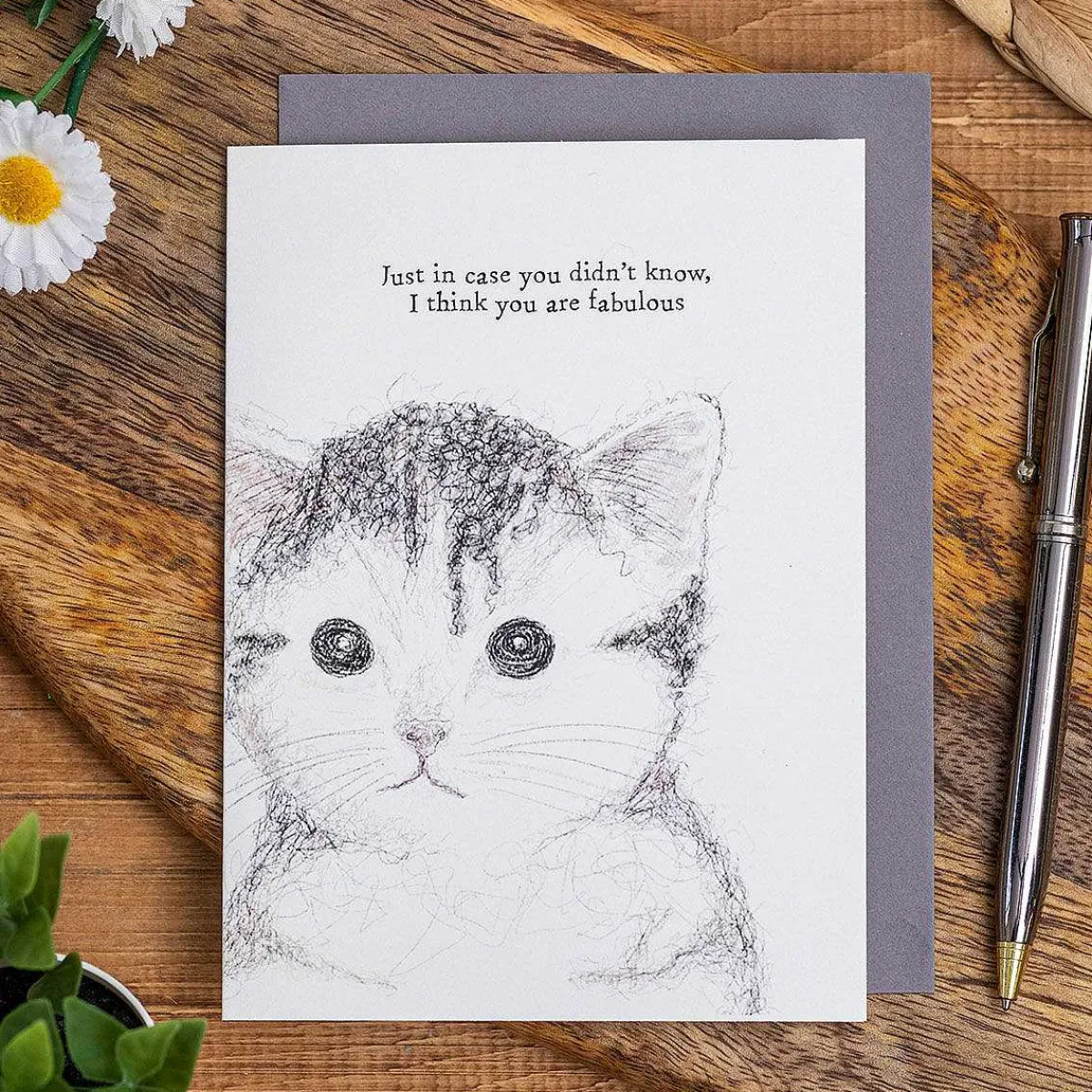 This Tasteful White Coloured Card Displays An Image Of An Endearing Cat With Large Black Eyes. The Card Has Text Above Which The Image Which Reads ‘Just In Case You Didn’T Know, I Think You Are Fabulous’ Written In The Traditional East Of India Style Font.