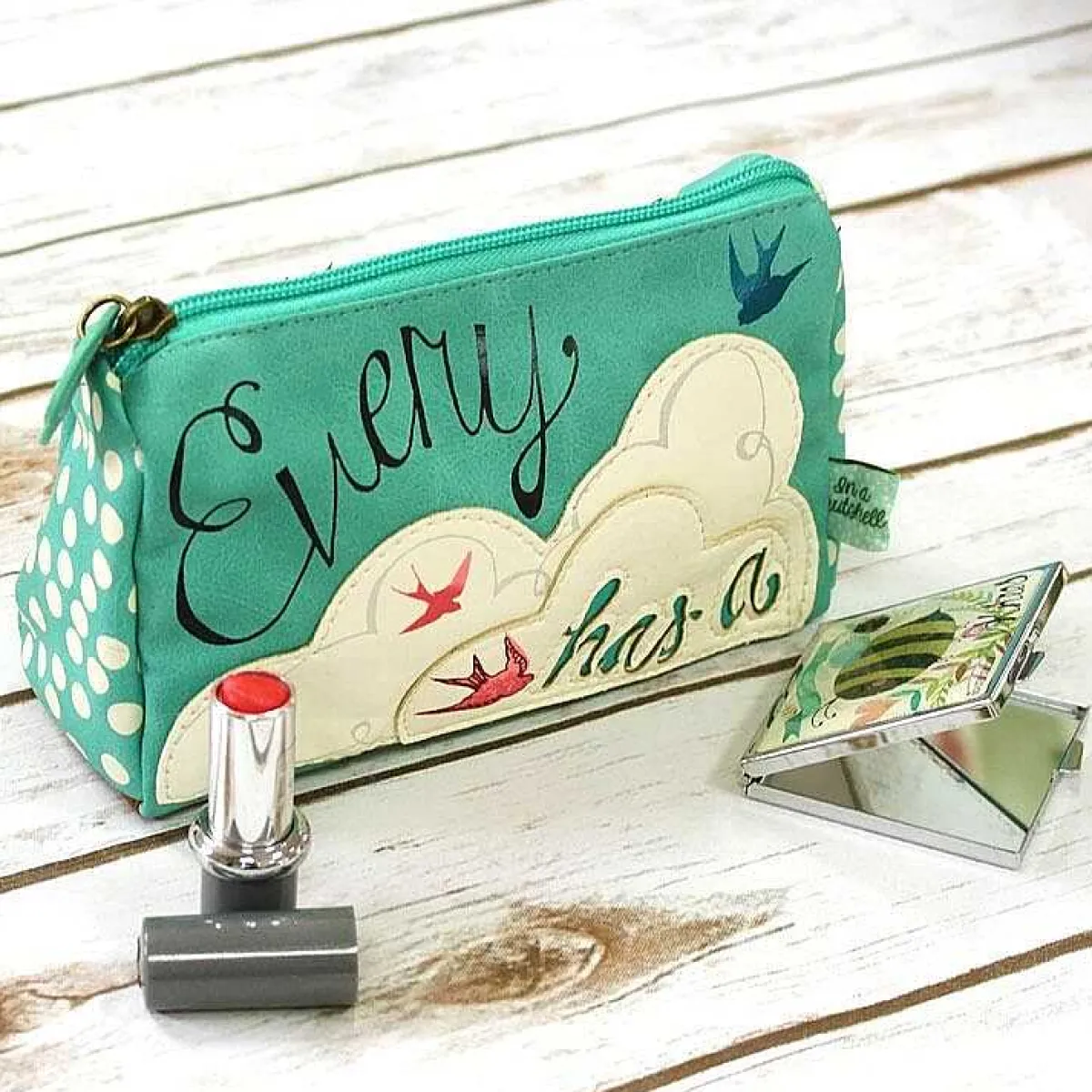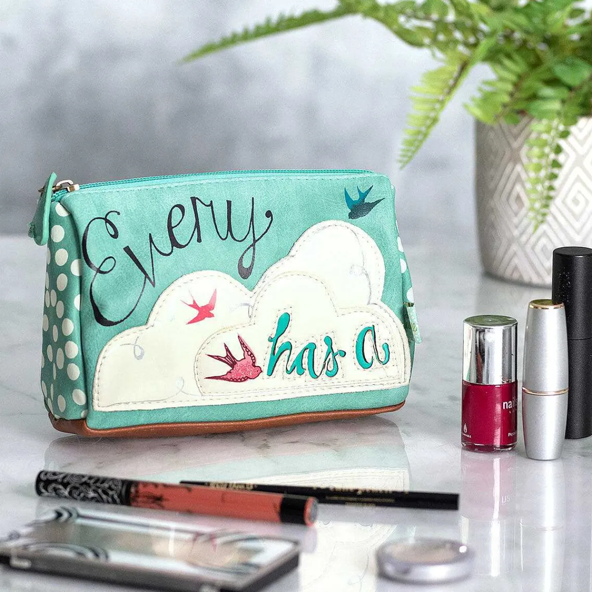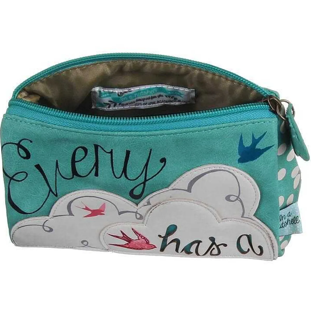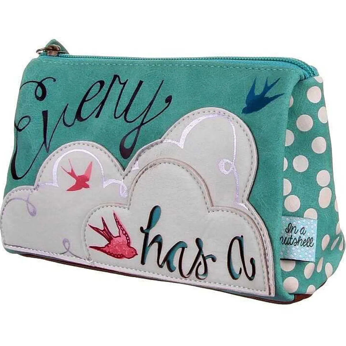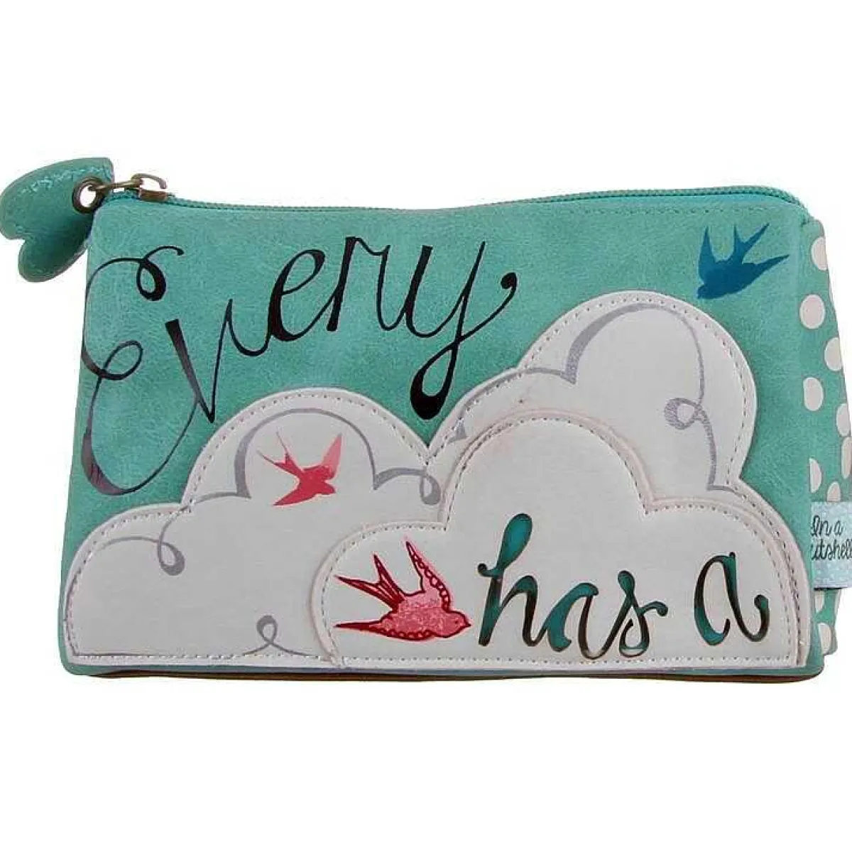 Part Of The In A Nutshell Collection, It Features A Stylish Design With Stitched On Layered Fabric. The Front Of The Bag Features Birds Flying Around A Cream Coloured Cloud, Making Up Part Of The Wording, “Every Cloud Has A” With “Silver Lining” Written On The Back Completing The Phrase.