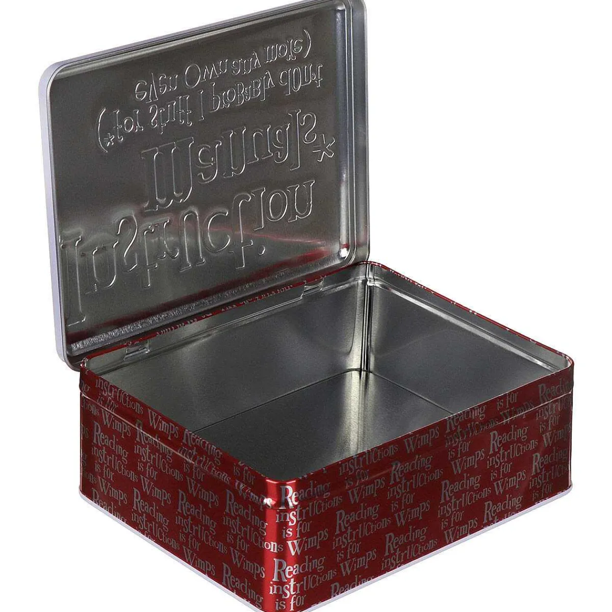 The Rectangular Tin Is Metallic Red Around The Sides With A White Lid. The Sides Feature The Words, ‘Reading Instructions Is For Wimps’ Repeated In Rows In A Decorative Silver Font. Embossed On The Lid Are The Words: