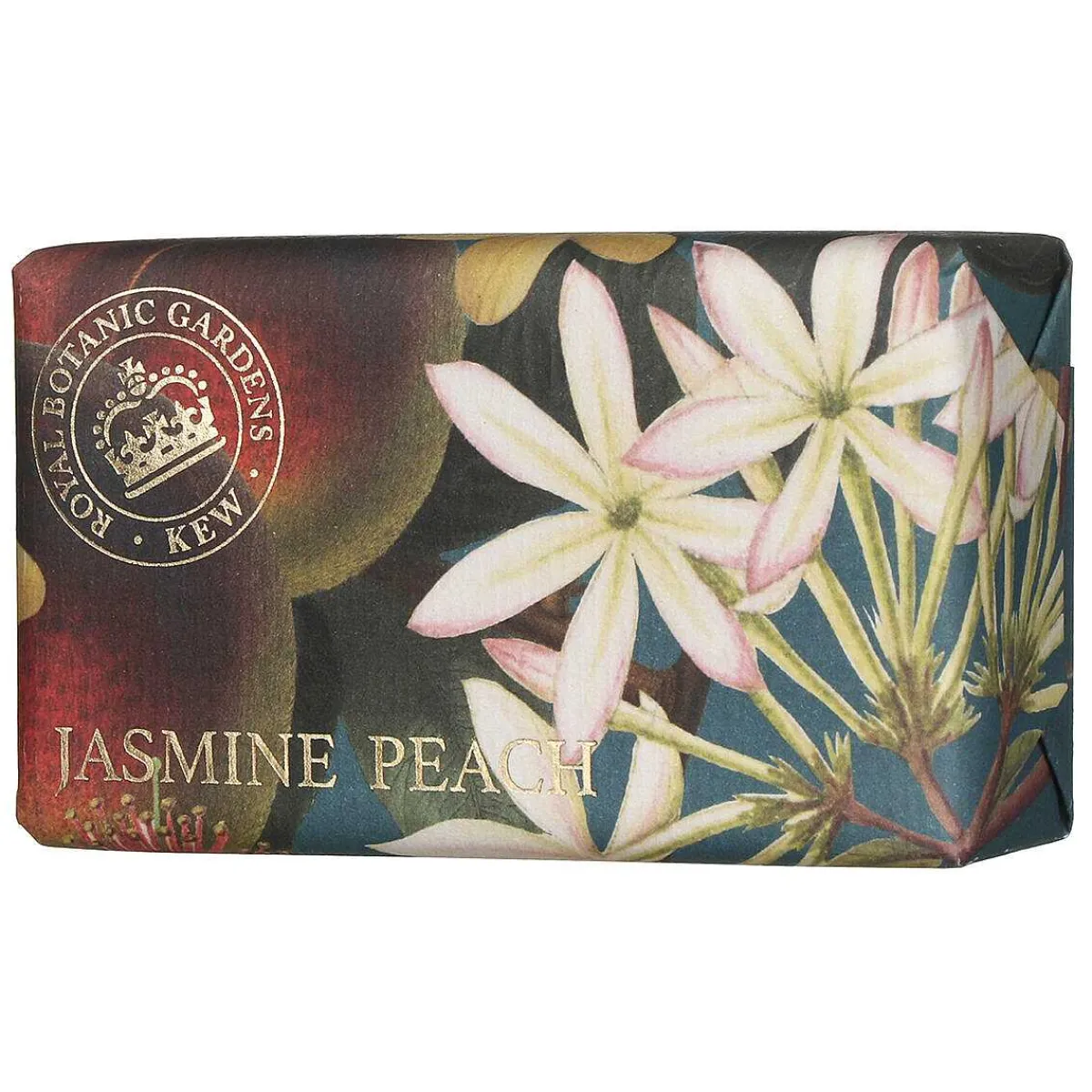 The Soap Bar Is Cream In Colour And Stamped With The Royal Botanic Gardens Logo In The Centre. It Is Beautifully Presented In A Floral Wrapper Which Is Decorated With Large White Jasmine Flowers And Orange Coloured Peaches. Complete With The Royal Botanic Gardens Logo In The Corner.