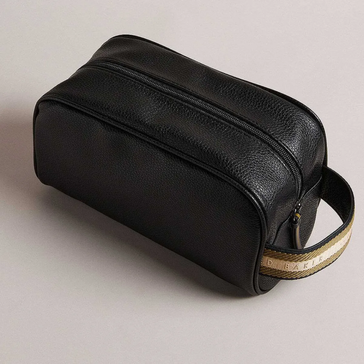 The Bag Is Made From Pu Which Is Water Resistant And Easy To Wipe Clean, With A Sleek Black Faux Leather Finish Featuring A Piped Edge, Along With A Debossed Ted Baker. One Side Of The Bag Features A Tastefully Striped Fabric Handle, And There’S A Matching Zip Pull For The Main Compartment.