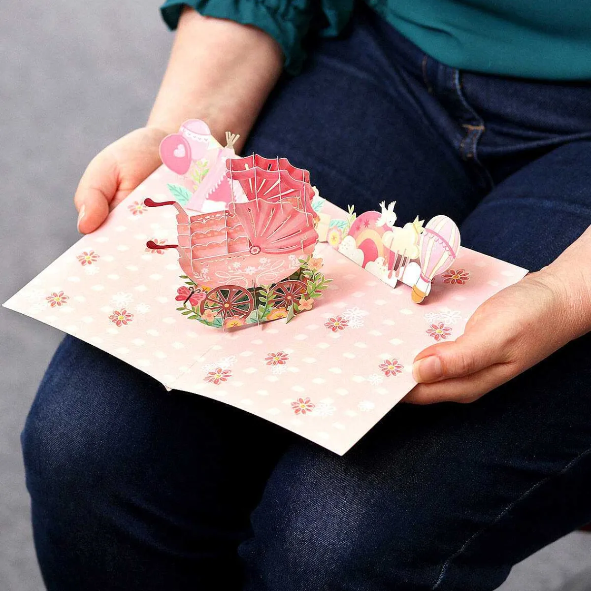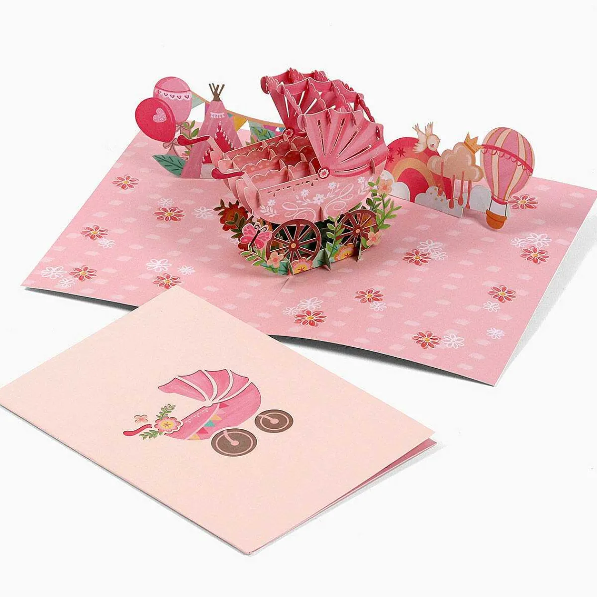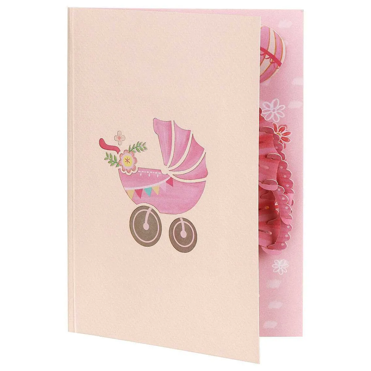 An Incredible Feat Of Paper Engineering, This Gorgeous 3D Card Looks Fabulous From Every Angle. The Front Of The Card Features An Elegant Cut-Out Illustration Of A Pram Embellished With Flowers, On A Baby-Pink Background. Open The Card To Reveal An Intricate Pop-Up Scene Depicting A Pink Pram Surrounded By Blooming Flowers, Baby’S Toys, Bunting And Balloons.