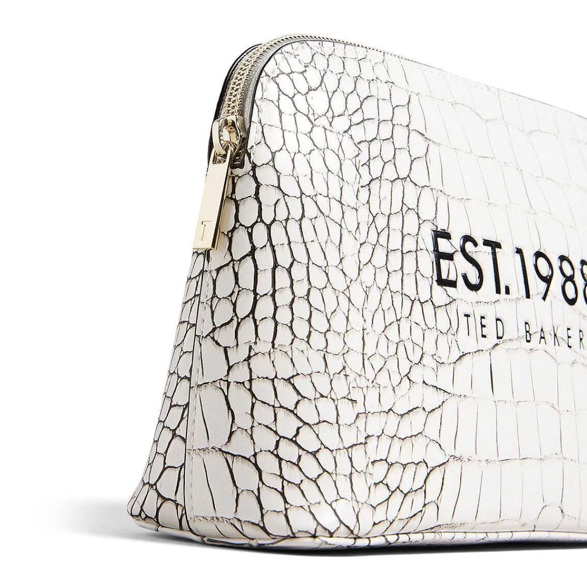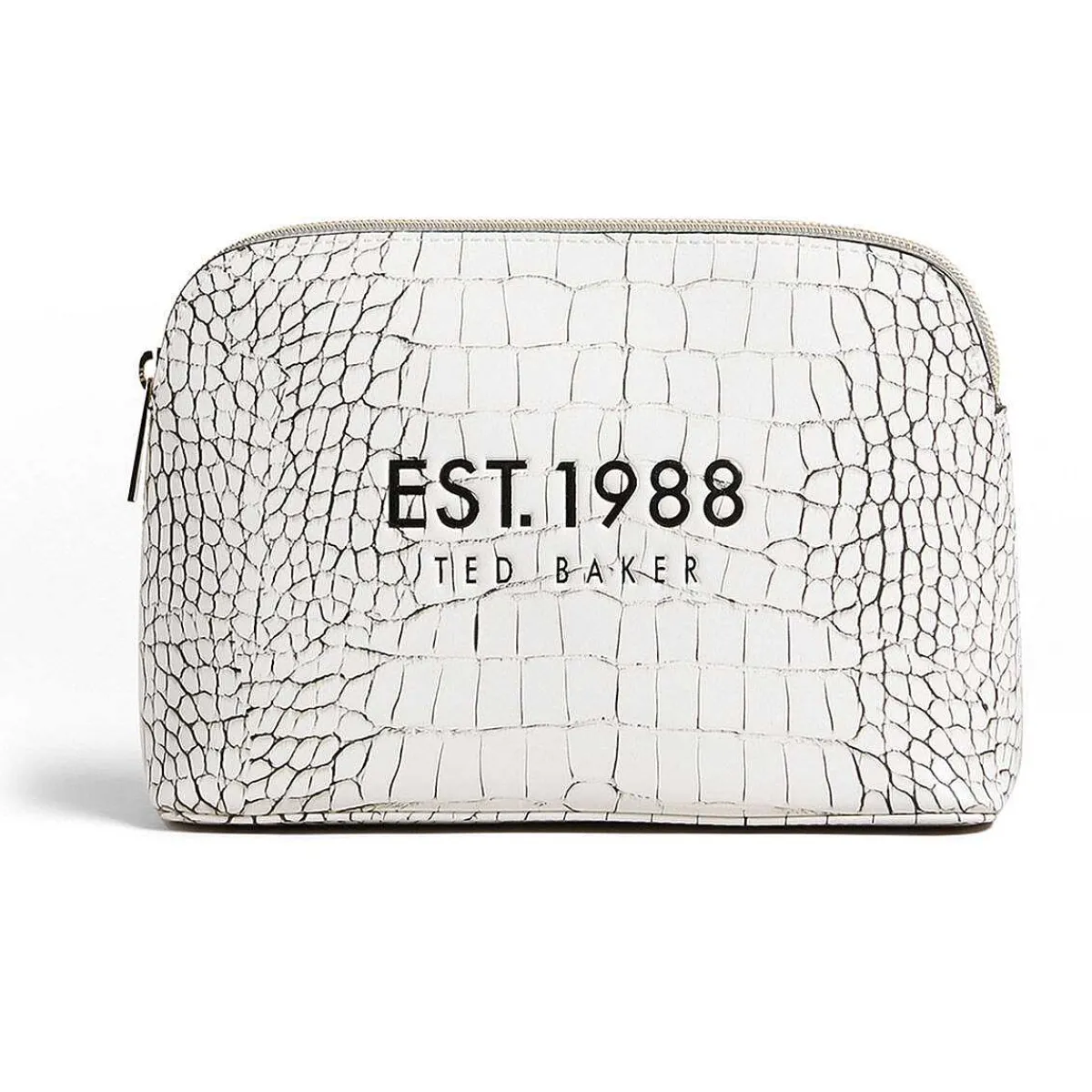 Made From Polyvinyl Chloride With A Cotton Lining, This White Leatherette Makeup Bag Is Decorated With Stylish ‘Imitation Croc’ Pattern Which Has Been Embossed Onto The Exterior, Along With The Ted Baker And The Text ‘Est. 1988’ In Black. Keep Everything Safe And Secure In Your Makeup Bag With The Gold External Zip Which Has A Zip Pull That Is Embossed With The Ted Baker ‘T’. The Interior Has A White Lining And Has Plenty Of Space For Everything You Need, From Lipstick To Foundation, Eyeshadow To Contour.