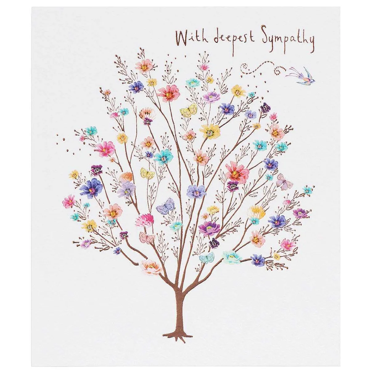 This Gorgeous Cream Card Is Decorated With A Rose Gold Tree Filled With Colourful Flowers And Butterflies And A Small Bird Flying Above The Tree! There Is Text Above The Tree Which Reads ‘With Deepest Sympathy’.