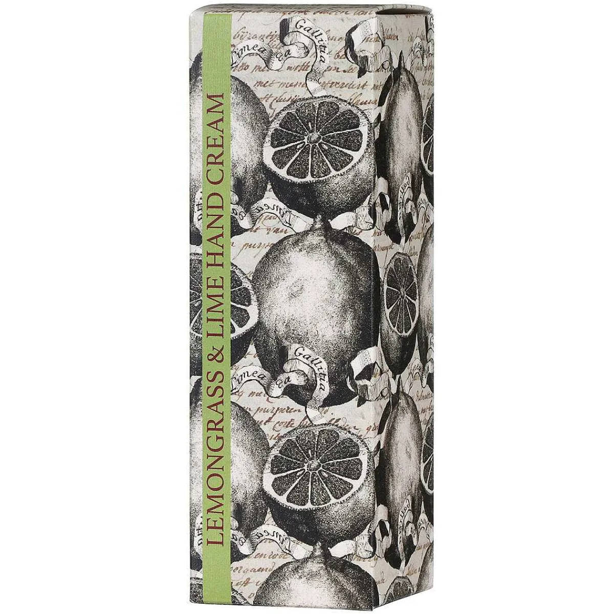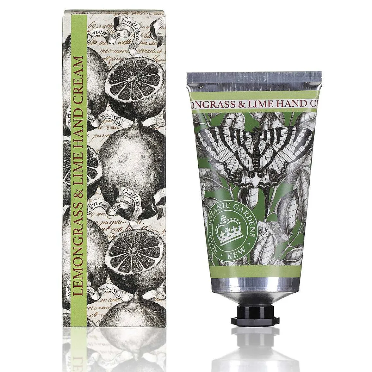 Containing Beautiful Aromas Of Lemongrass And Lime, This Scented Hand Cream Is Enriched With Aloe Vera And Vitamin E And Is A Marvellous Moisturising Solution For Hands That Need Some Love And Care. The 75Ml Tube Has A Screw Top Lid And Features A Butterfly Surrounded By Leaves On A Green Background. The Box It Comes In Compliments The Design On The Tube With Vintage Writing Style On Paper And Black And White Lemons And Limes.