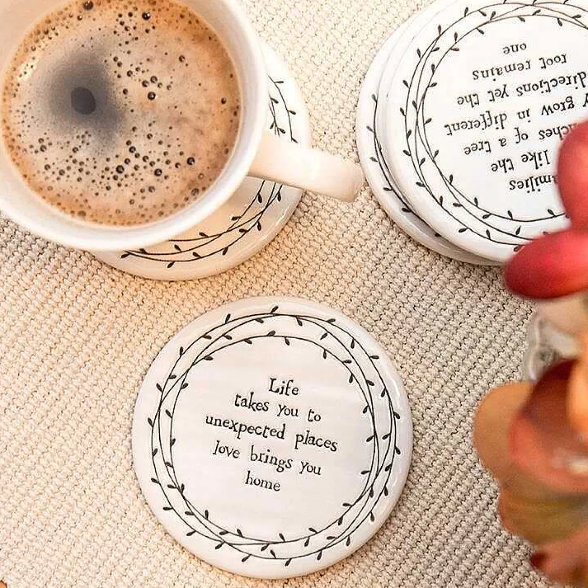 Made Of Beautiful Porcelain, This Coaster Is Perfectly Round In Shape And Features A Debossed Vine Design Running Around The Circumference Of The Piece.The Words “Life Takes You To Unexpected Places, Love Brings You Home” Are Also Debossed In The Centre Of The Circular Coaster On The Lightly Rippled Porcelain Material.