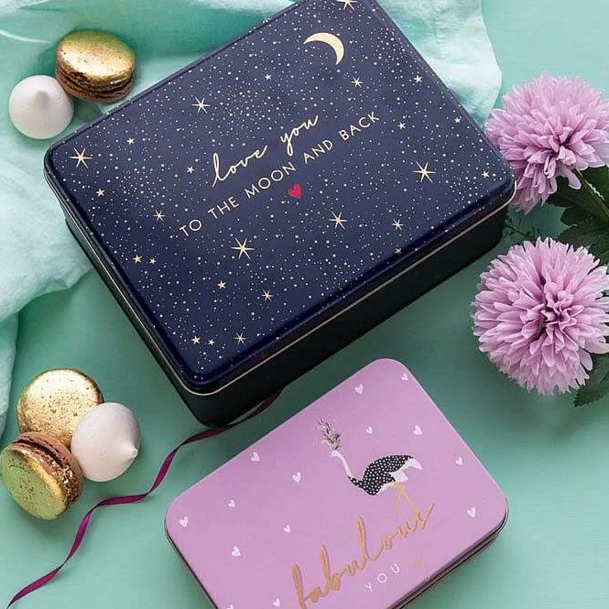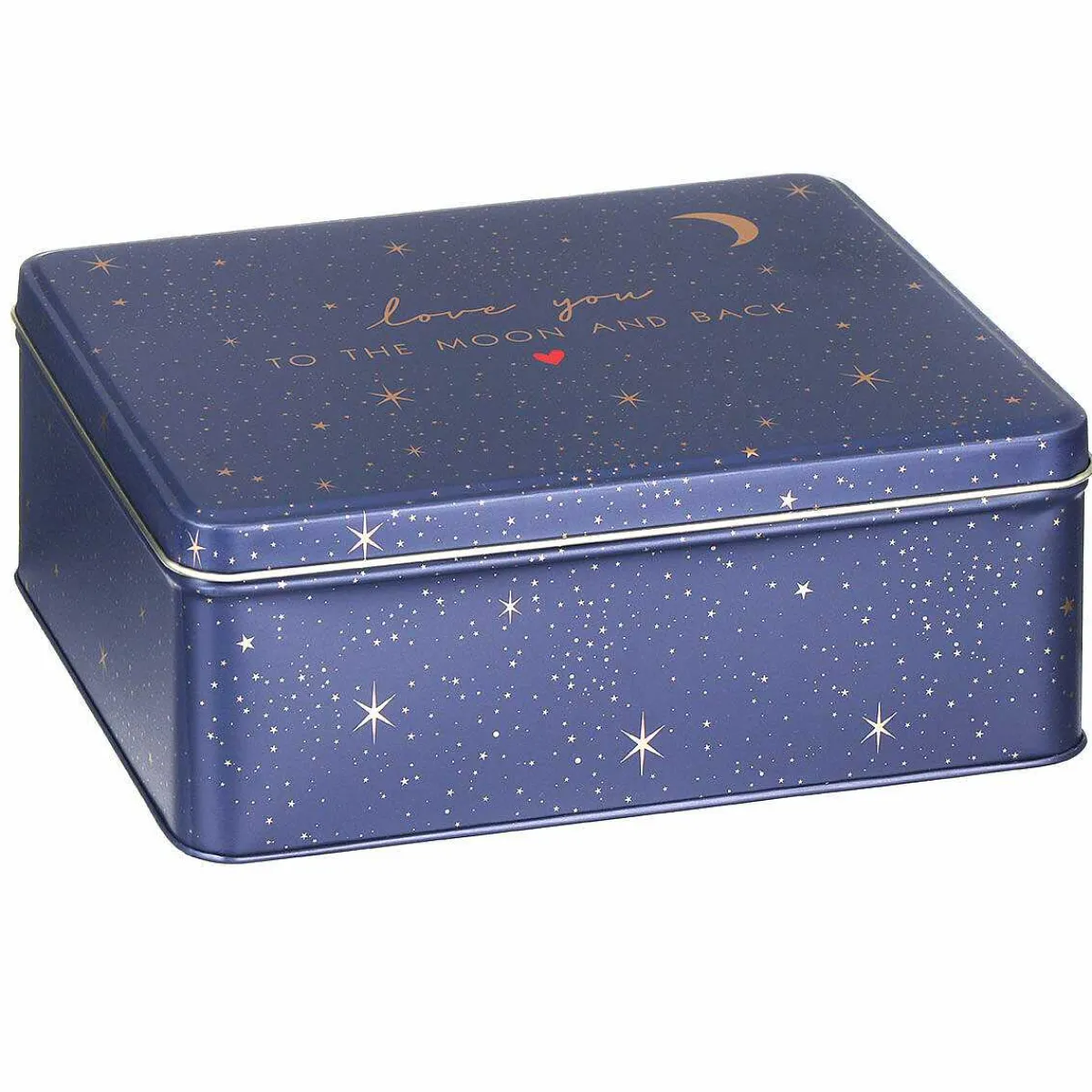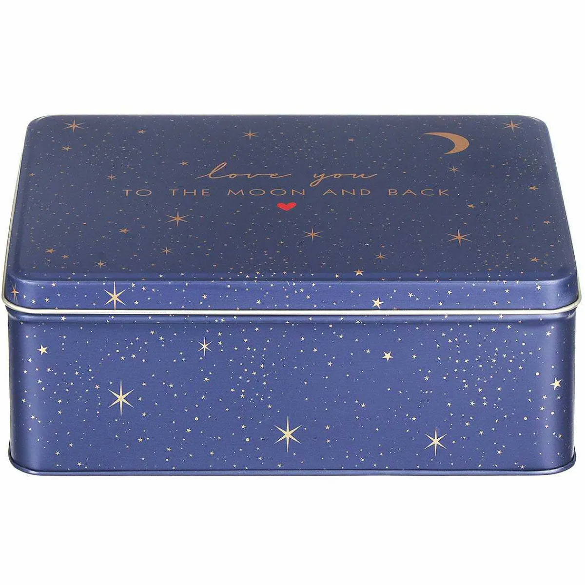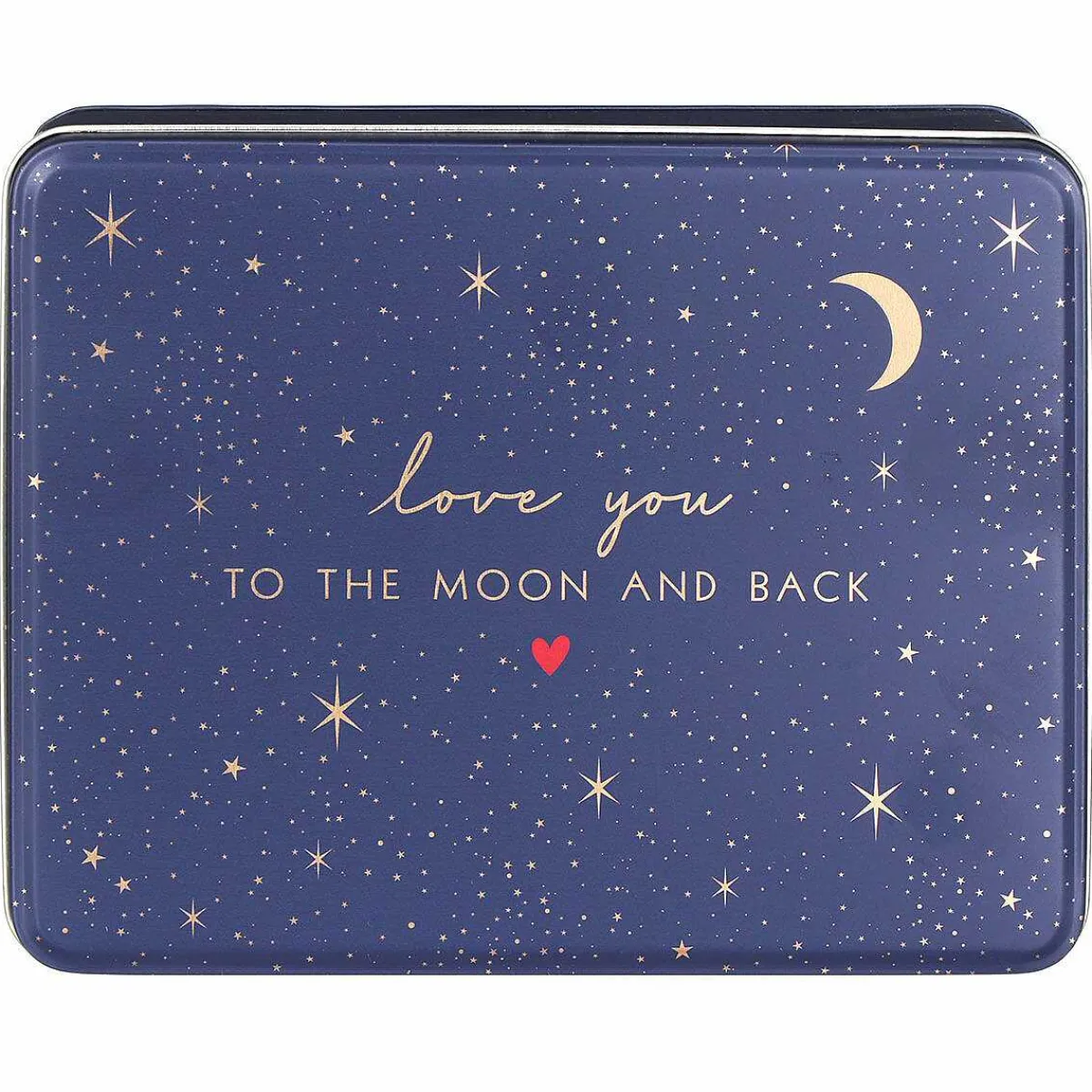 The Striking Design Features A Scatter Of Golden Stars Set Upon A Deep Blue Background. The Design Is Complete With The Phrase ‘Love You To The Moon And Back’ Written In Two Contrasting Fonts, Script And Uppercase With A Single Dainty Red Heart Beneath It. The Lid Of The Tin Simply Pushes On, Keeping The Content Safe And Secure Wherever You Choose To Place It.