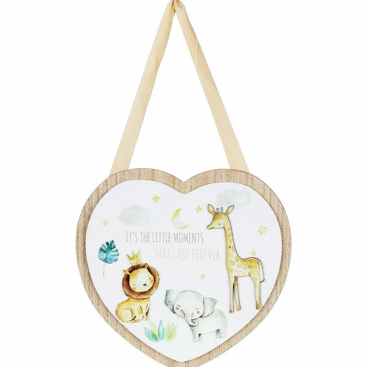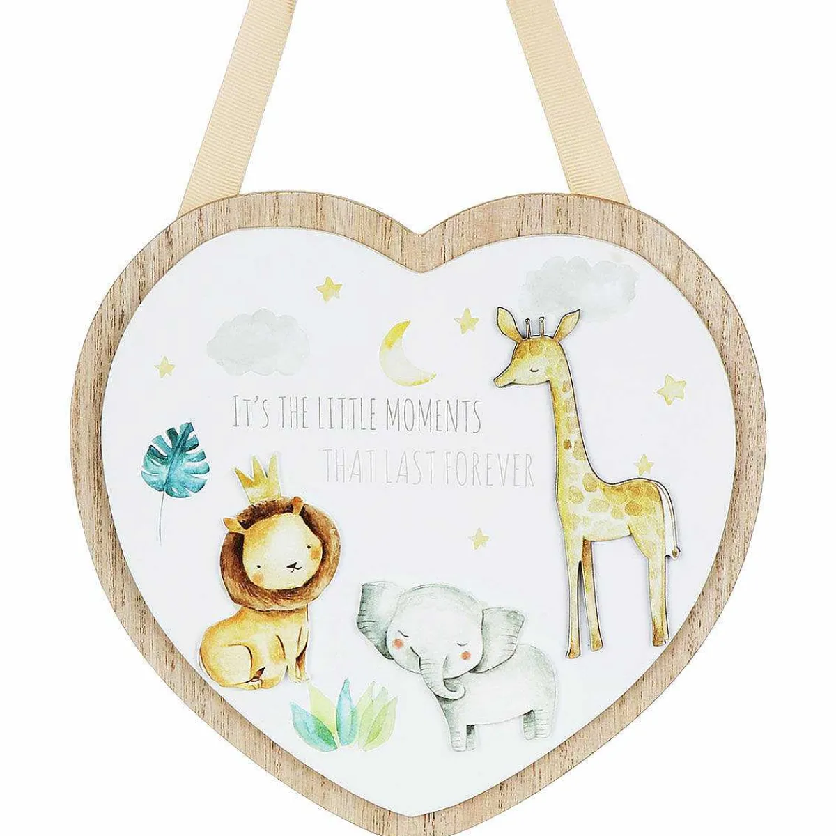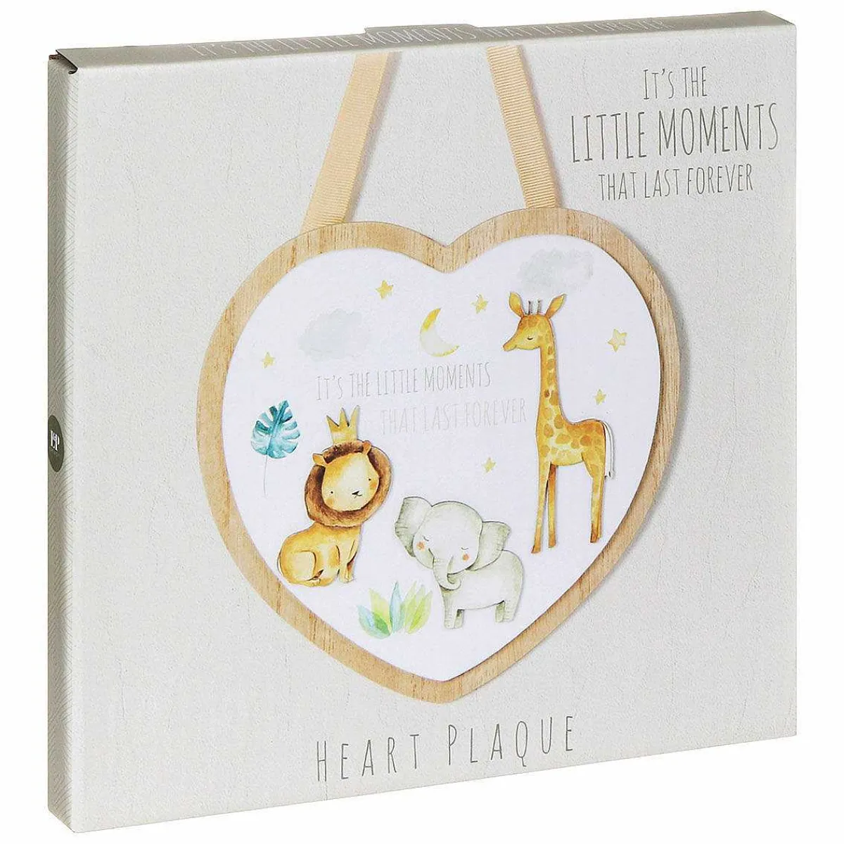 A Lovely Gift That Is Sure To Bring A Smile To Their Face, This Lovely Wooden Heart Is Beautifully Styled With Text That Reads ‘It’S The Little Moments That Last Forever’. There Are Beautiful, Watercolour Illustrations Of Safari Animals Decorating The Cushion Such As An Elephant, A Giraffe And A Lion Wearing A Crown, The King Of The Jungle. Scattered Around Are Little Stars, Clouds And Foliage That Give A Fun, Colourful Touch To The Design. The Sign Has Sand Coloured Ribbon So You Can Hang It Anywhere In Your Home.
