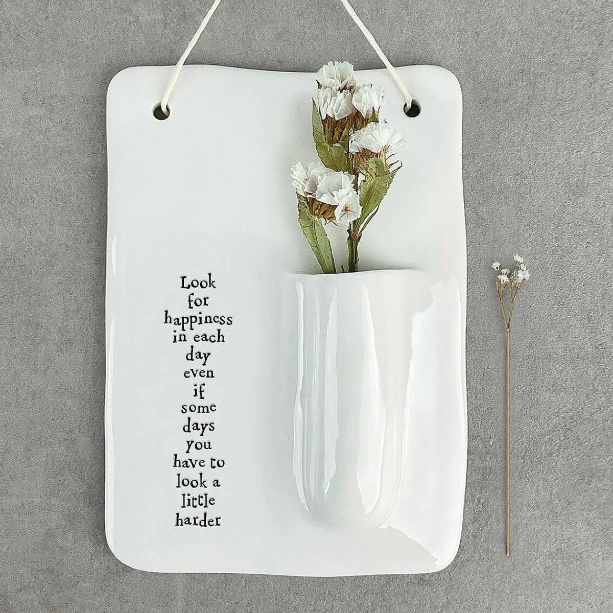 This Sign Features A Ceramic Pocket Which Is Perfect For Displaying A Small Bunch Of Buds Or Flowers. On The Front Of The Vase The Words Feature ‘Look For Happiness In Each Day Even If Some Days You Have To Look A Little Harder’. Hang This Delightful Anywhere In Your Home With The Length Of String Attached To The Top.