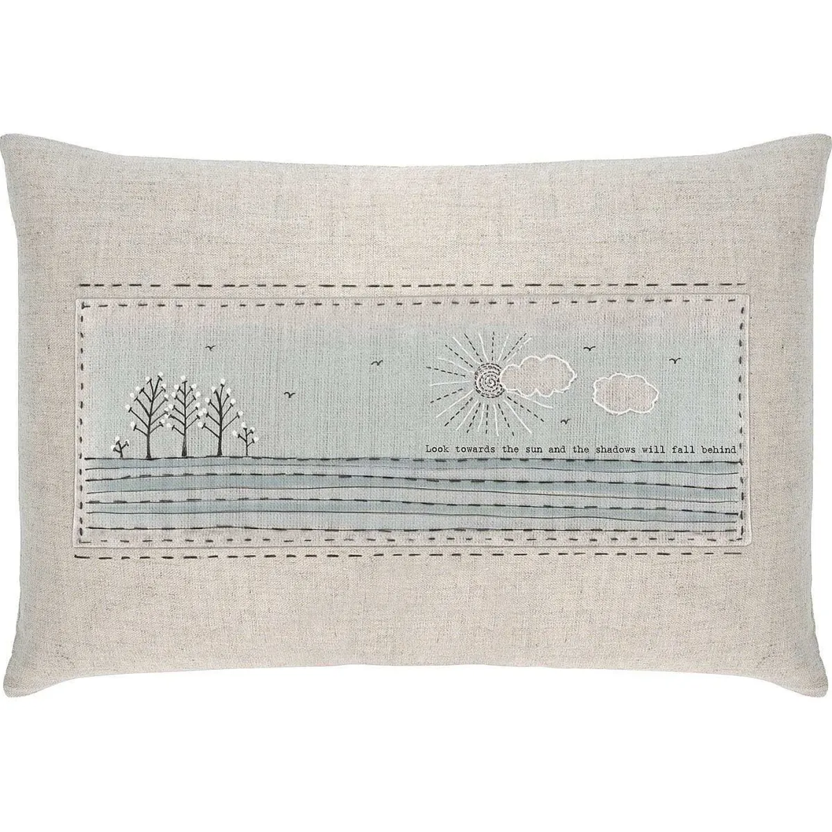 This Charming Cushion Features A Natural Canvas Cover And Is Feather Filled. The Front Of The Cushion Depicts The Scene Of A Ploughed Field With Five Blossom Trees, Sunshine With Clouds And Birds In The Sky. The Message ‘Look Towards The Sun And The Shadows Will Fall Behind’ Is Printed In A Small Typewriter Style Font Across The Middle On The Right Hand Side. This Heartfelt Cushion Is Taupe In Colour With Grey Blue Tones.