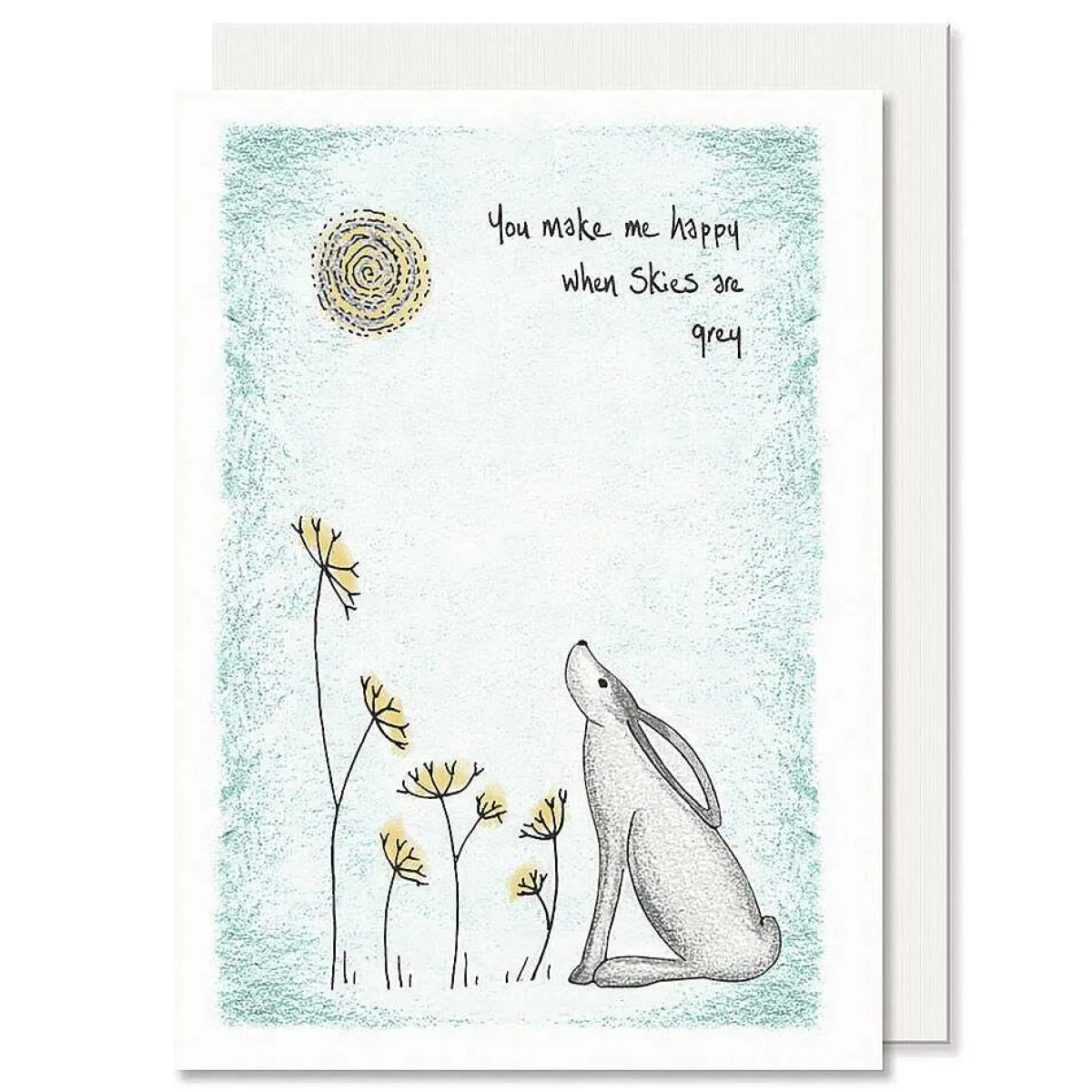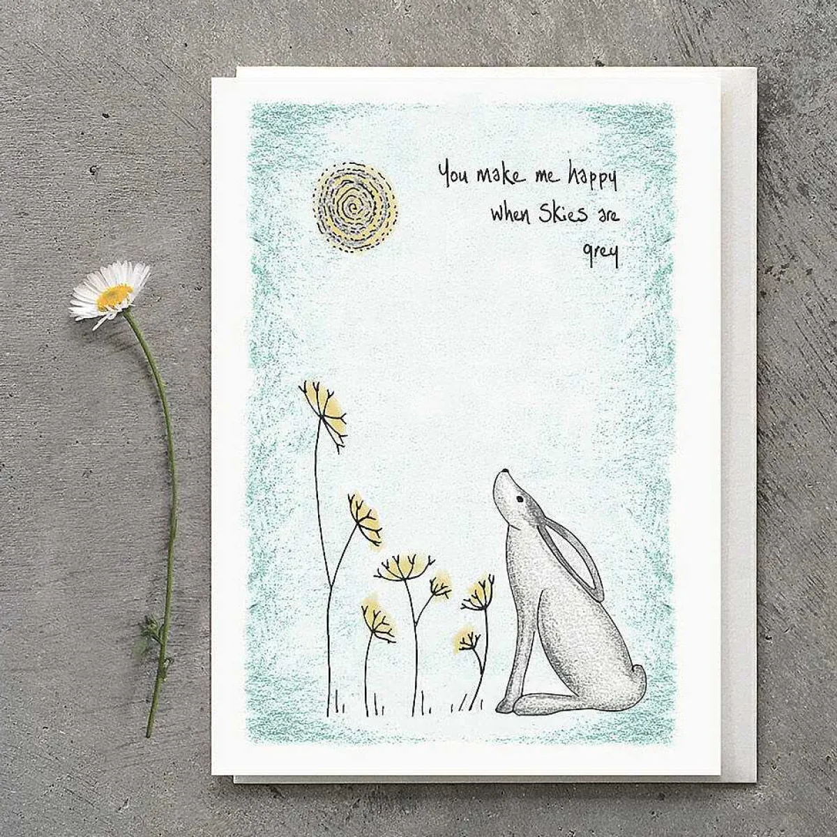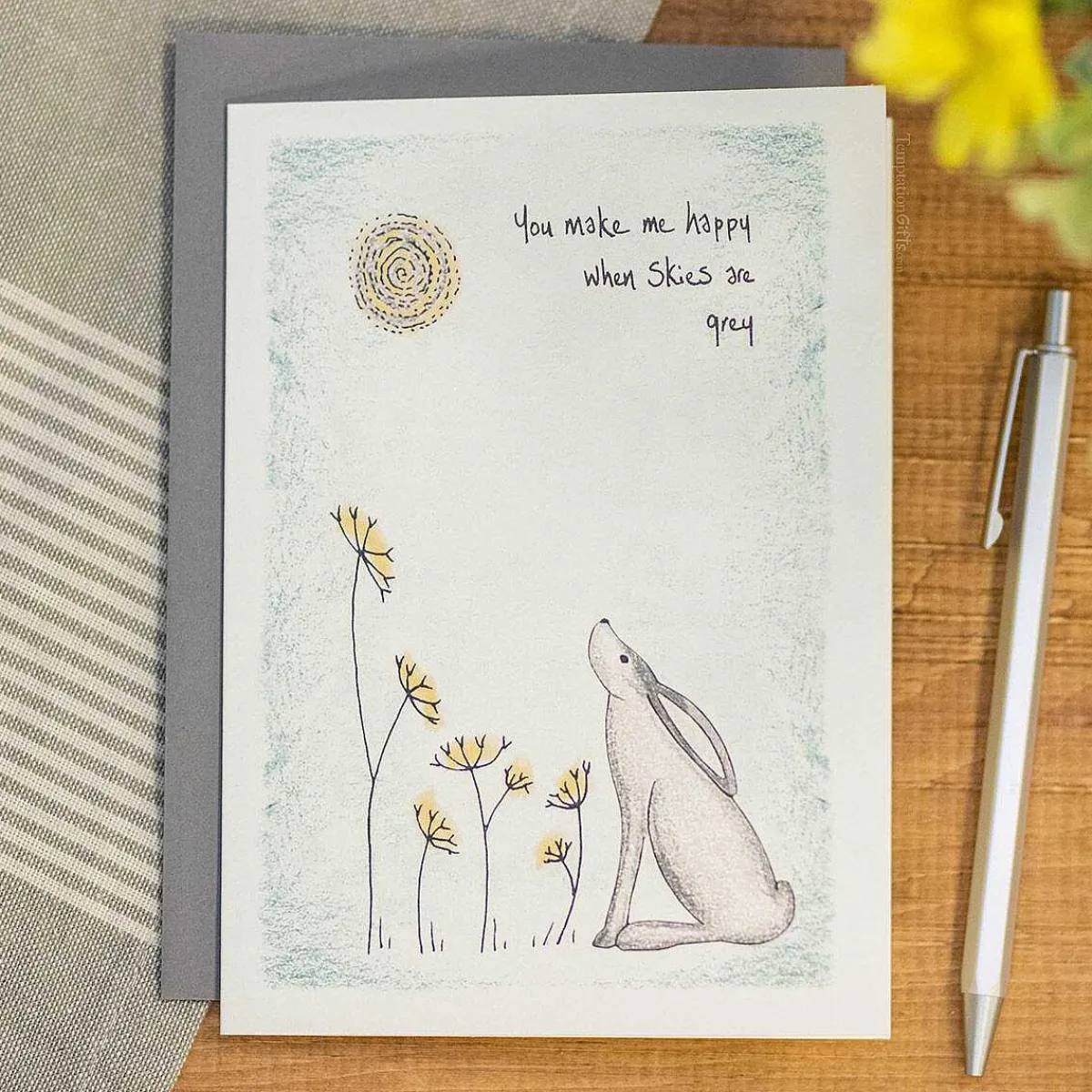 This Tasteful Cream Coloured Card Displays An Image Of A White Hare Looking Towards The Sun Sat Amongst Yellow Wildflowers. The Card Has Text At The Top Of The Design Which Reads ‘You Make Me Happy When Skies Are Grey’ Written In The Traditional East Of India Style Font.