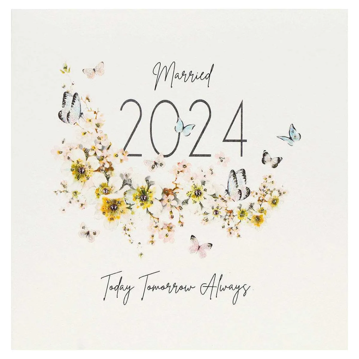 This Square Card Features A Stylish Design With An Illustration Of Butterflies And Blossoms That Have Been Exquisitely Finished With Glitter And Diamantes Which Glisten And Sparkle. This Stunning Design Is Set Against A Cream Background, And Has A Message Written In A Stylish Handwritten Font Which Reads;