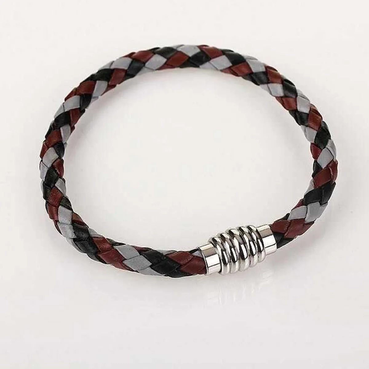 This Bracelet Is Made With Genuine Leather; The Magnetic Clasp Is Plated With Real Silver. The Leather Is Plait Into A Pattern They Are All Different Colours, Grey, Red And Black.