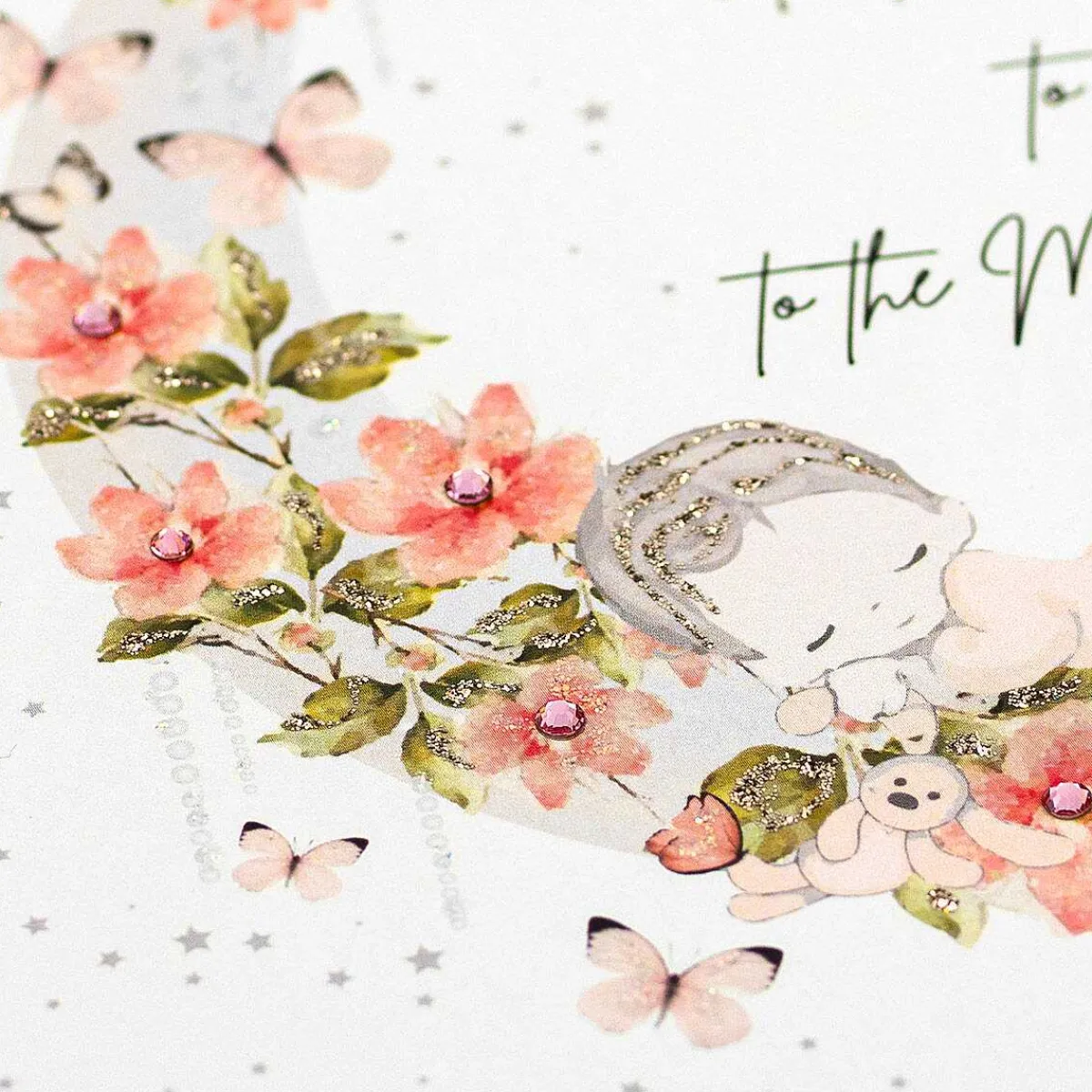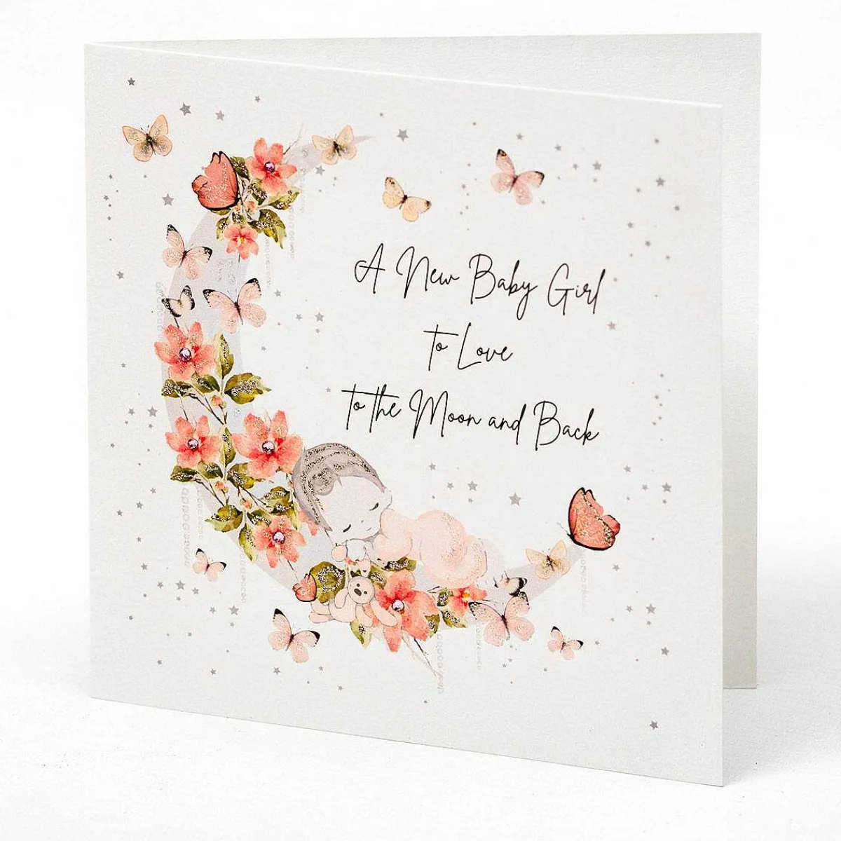 The Front Of This Gorgeous Card Is Decorated With An Adorable Baby Girl Sleeping On A Crescent Moon Festooned With Vibrant Pink Flowers, Surrounded By Twinkling Stars And Fluttering Butterflies. The Design Has Been Embellished By Hand With Glitter And Diamantes That Shimmer And Sparkle In The Light, With A Message On The Front That Reads;