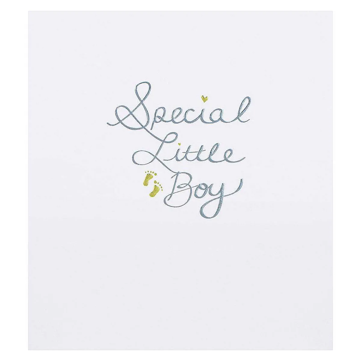 Celebrate The Birth Of A New Baby With This Simple And Elegant Greetings Card. The Front Of The Card Features The Words ‘Special Little Boy’ Embossed In Silver Script On A Textured Surface, Decorated With Two Small Gold Footprints.