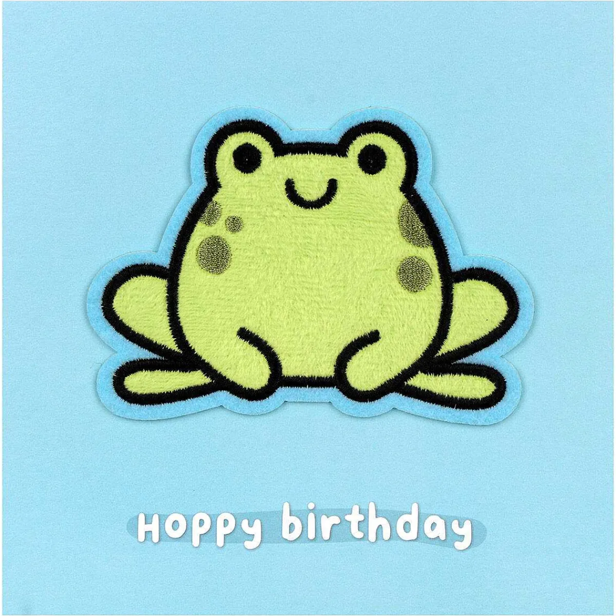 The Card Is Blue With White Text That Says, ‘Hoppy Birthday’, And Features A Reusable Kawaii Inspired Frankie Frog Felt Patch Decorated With Stitched Details Which Looks Simply Adorable!