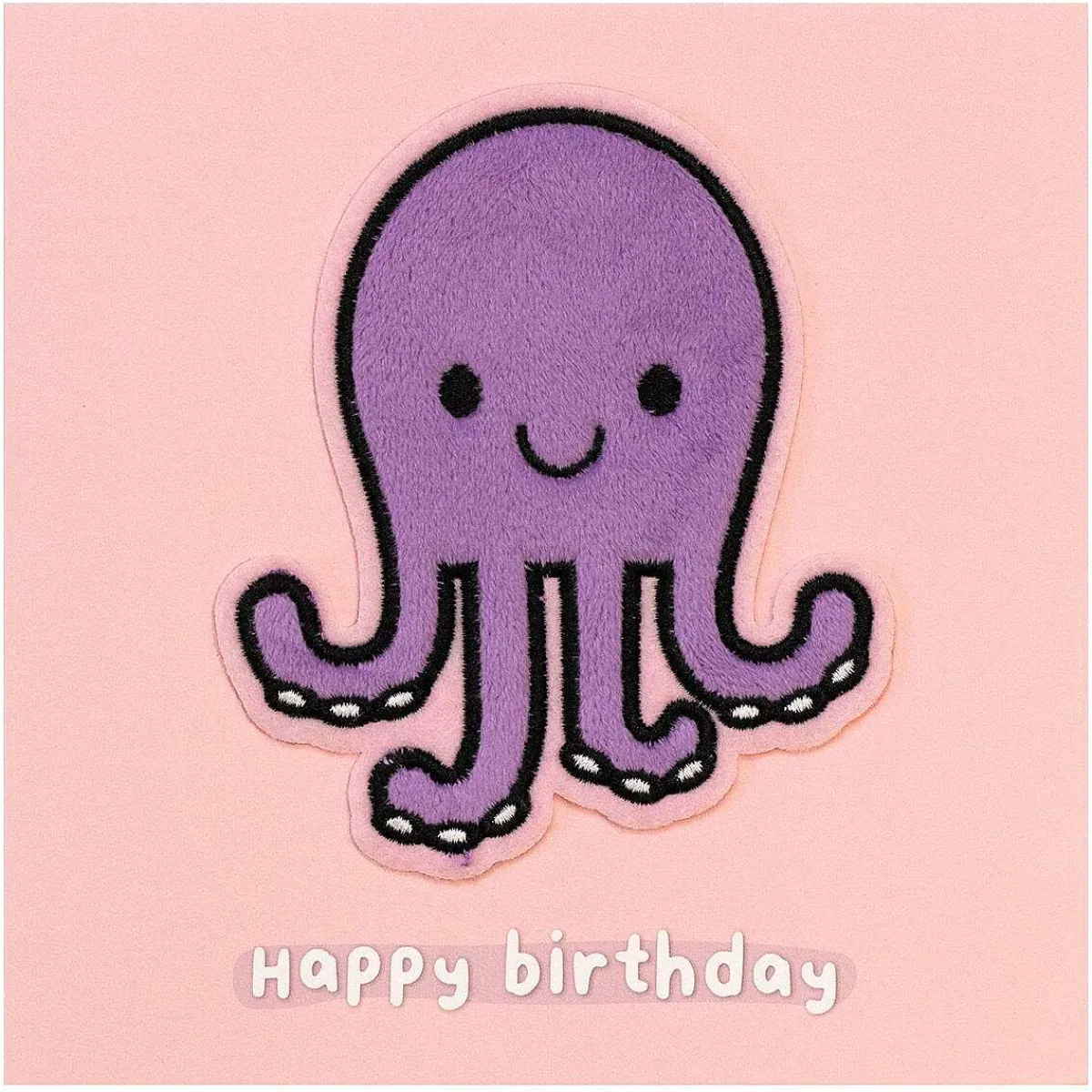The Card Is Pink With White Text That Says, ‘Happy Birthday’, And Features A Reusable Kawaii Inspired Violet Octopus Felt Patch Decorated With Stitched Details Which Looks Simply Adorable!