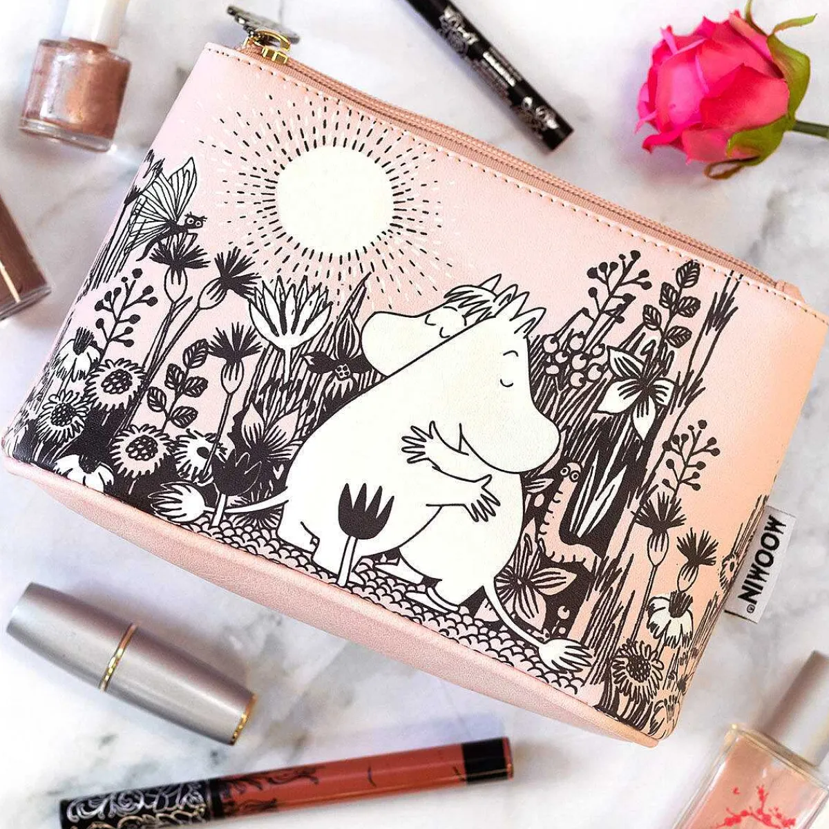 This Make-Up Bag Is Pink In Colour And Sports A White And Black Illustrated Design Across The Front. The Bag Is Plentiful In Size For A Modern Day Women’S Make-Up Needs Including Setting Sprays And Even Brushes, With A Singular Large Opening Along The Top. This Is Reached Using The Adorable And Weighted Moomin Zip-Pull In A Brushed Dark Gold Colour. The Inside Lining Of The Make-Up Bag Is A Mellow Grey, In A Waterproof Material To Ensure All Of Your Cosmetics Secure. With Their Usual Attention To Detail, Disaster Designs Have Even Included A Card Product Label Which Can Be Folded To Stand Up, Embossed With The Moomin Logo And Featuring A Dancing Popup Moomintroll.
