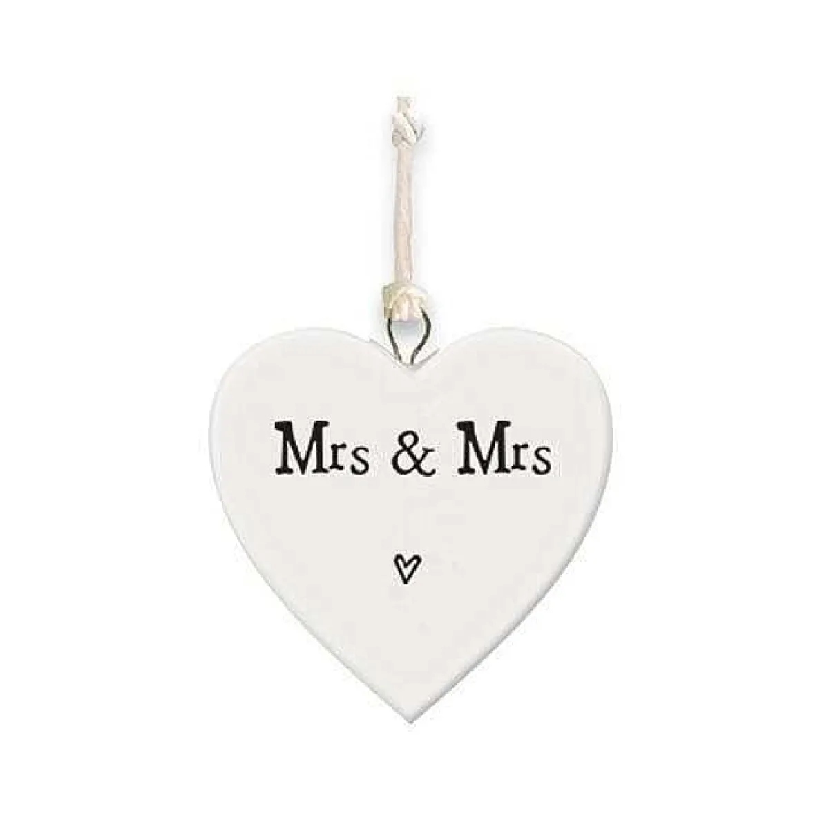 A Subtle Decoration But A Very Touching Sentiment, This Hanging Heart Is Made From A Shining Porcelain Material, Creating A Light Rippled Effect Over Its Surface. Subtle In Terms Of Its Design, It Features The Quoted Words “Mrs And Mrs” In A Debossed Black Quirky Font Complete With A Miniature Illustration Of An Outlined Heart Below.