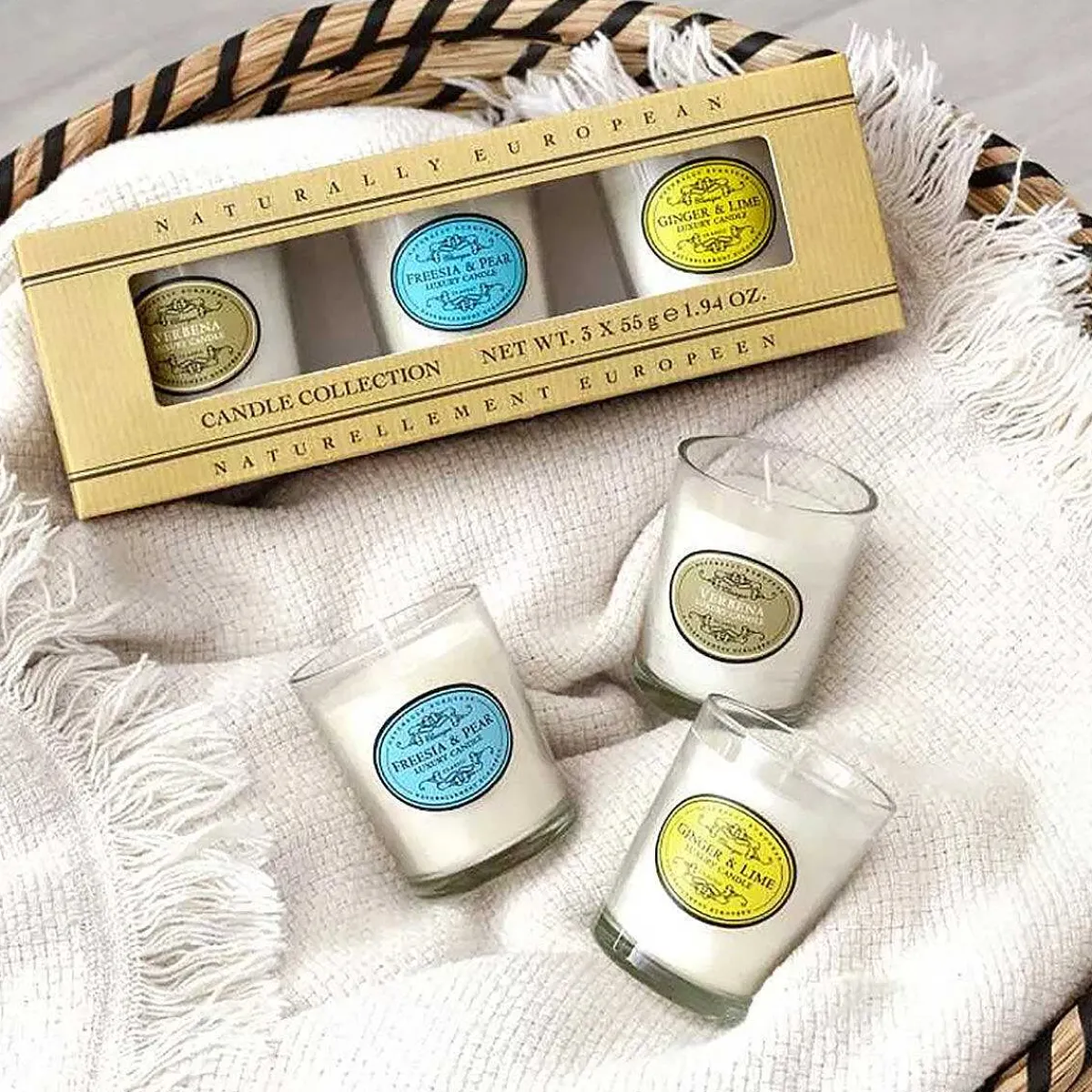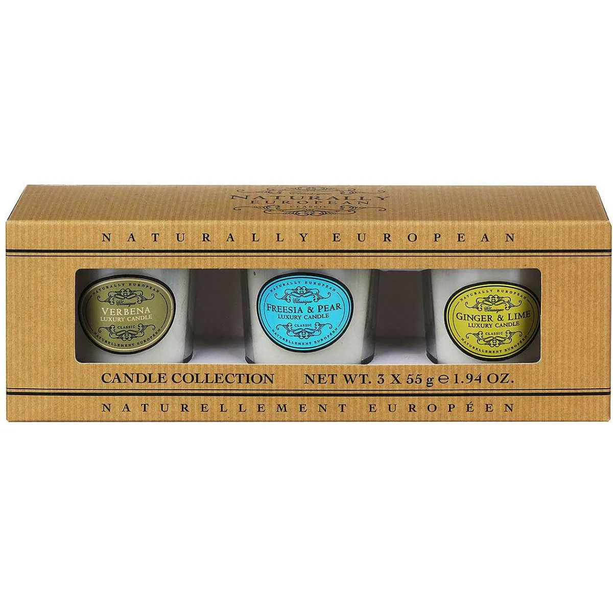 Each Clear Glass Votive Features The Classic, Vintage Inspired Naturally European Logo. This Trio Of Candles Comes Presented In A Brown Box With Window Display.