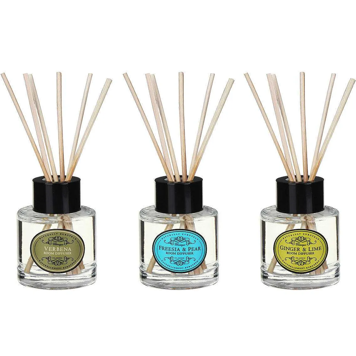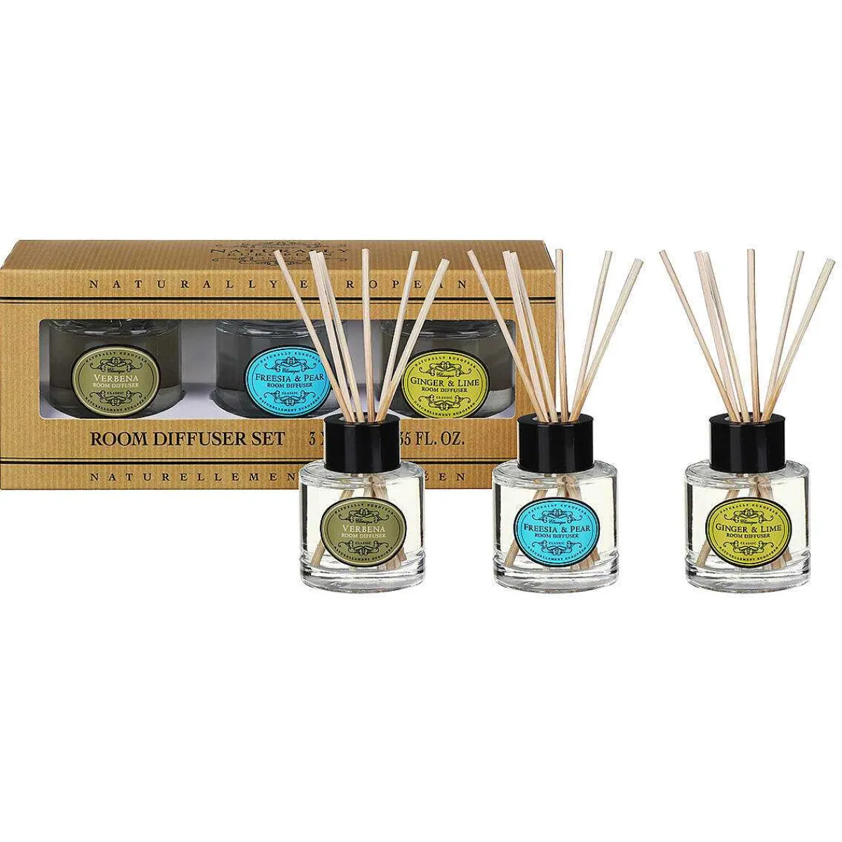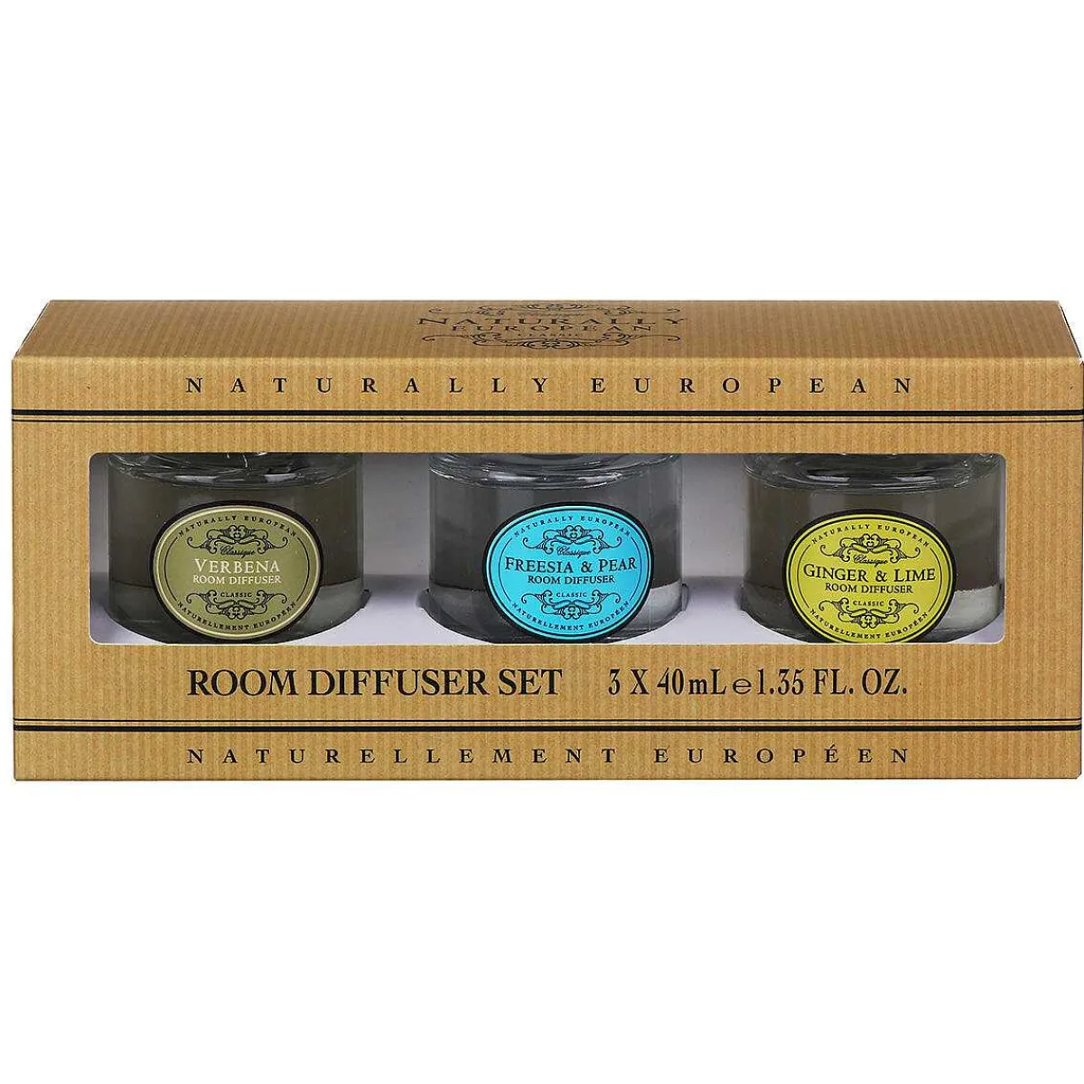 Each Clear Glass Bottle Features The Classic, Vintage Inspired Naturally European Logo. This Trio Of Reed Diffusers Comes Presented In A Brown Box With Window Display.