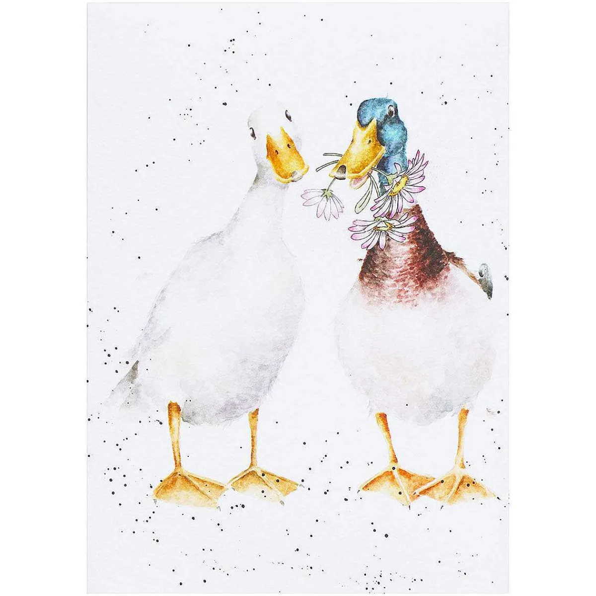 The Front Of This Card Features A Wonderful Illustration Which Depicts A Pair Of Ducks, One Mallard And One Pekin Duck. The Ducks Are Stood Side By Side With The Mallard Holding A Bunch Of Daisies In Its Beak. The Design Is Painted In The Soft Watercolour Style Of Artist Hannah Dale, Depicted With Intricate Detail And Surrounding The Illustration Are Speckles Of Black Paint, In A Way That Is Synonymous With The Wrendale Brand.