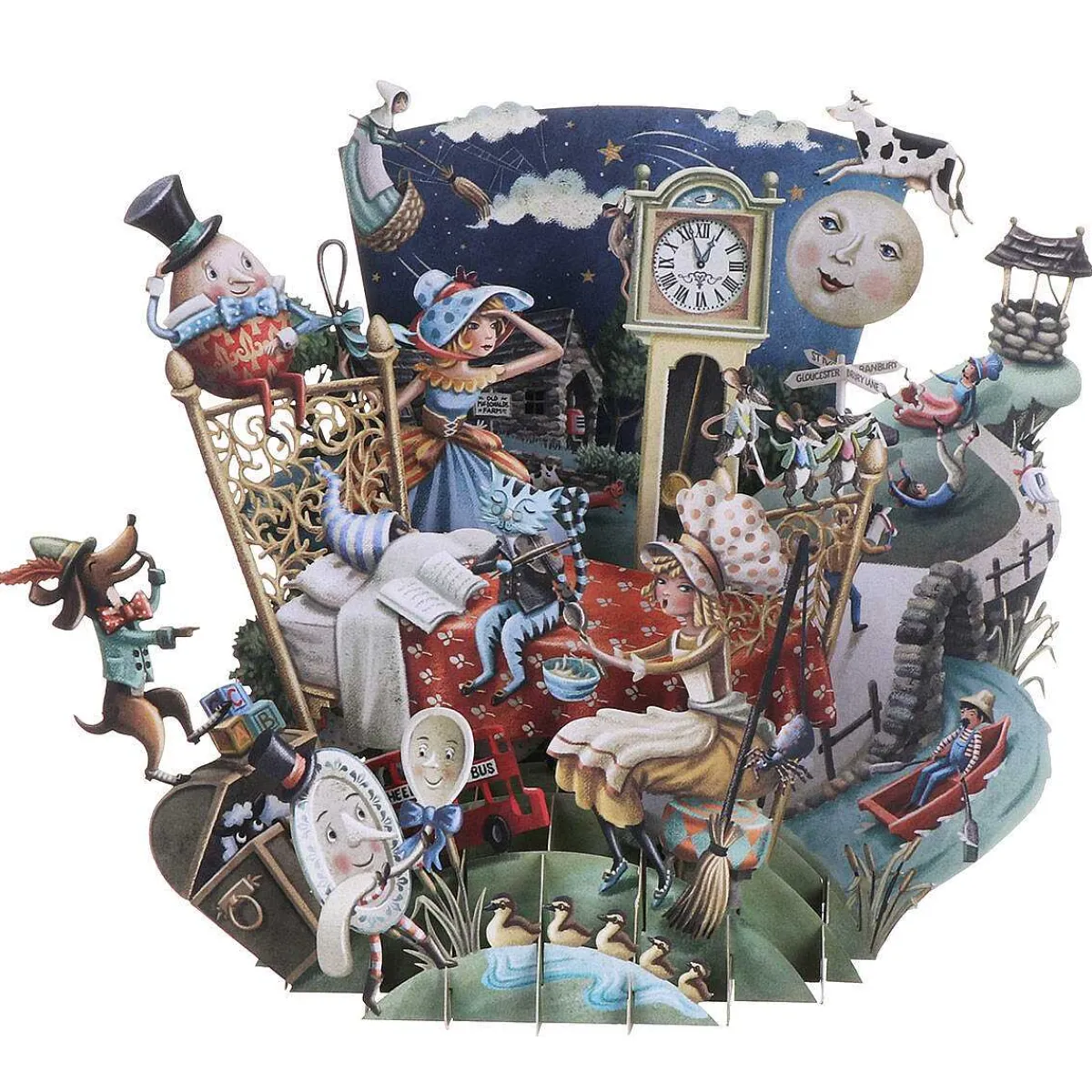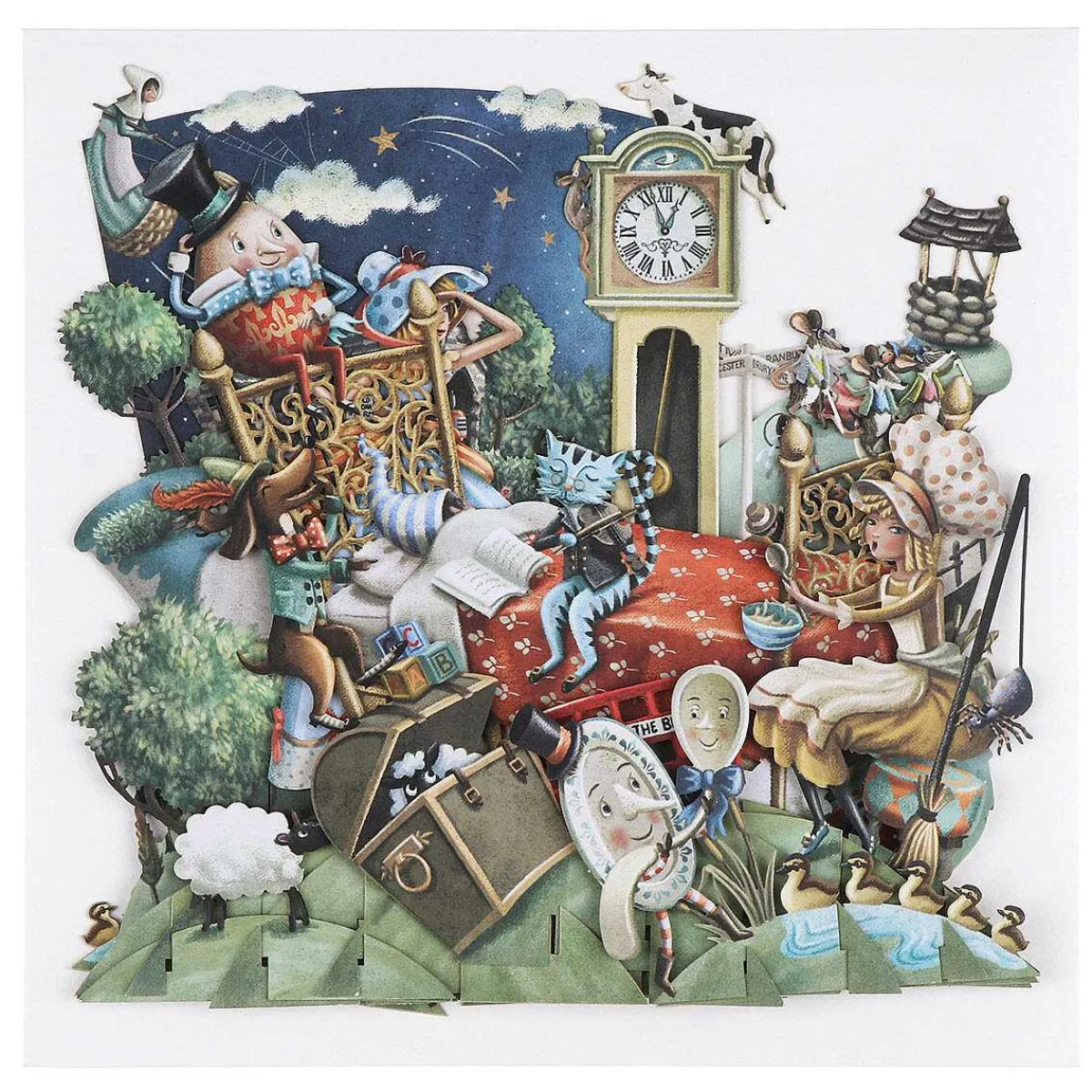 The Popup 3D Card Is Beautifully Designed With Laser Cut, Intricate Details Bringing It To Life. It Depicts An Adorable Scene Akin To The Something Straight From Classical Nursery Rhymes. The Card Features An Ornate Bed Where A Child Is Sleeping. Around The Bed Are Familiar Nursey Rhyme Characters Including Humpty Dumpty, Little Miss Muffet And The Three Blind Mice Along With Those In The Rhymes Hickery Dickery Dock And Hey Diddle Diddle To Name Just A Few.