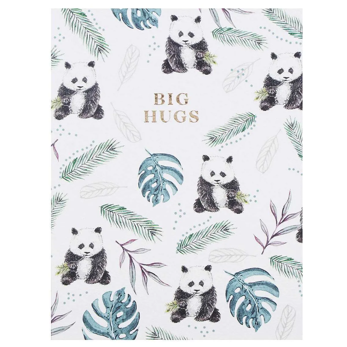 The Front Of This Card Is Decorated With Charming Watercolour Illustrations Of A Panda Eating Bamboo Along With Palm Leaves And Tropical Leaves In Scatter Pattern Against A Crisp White Background. The Words ‘Big Hugs’ Are Debossed In Metallic Gold Text That Shimmers And Sparkles.