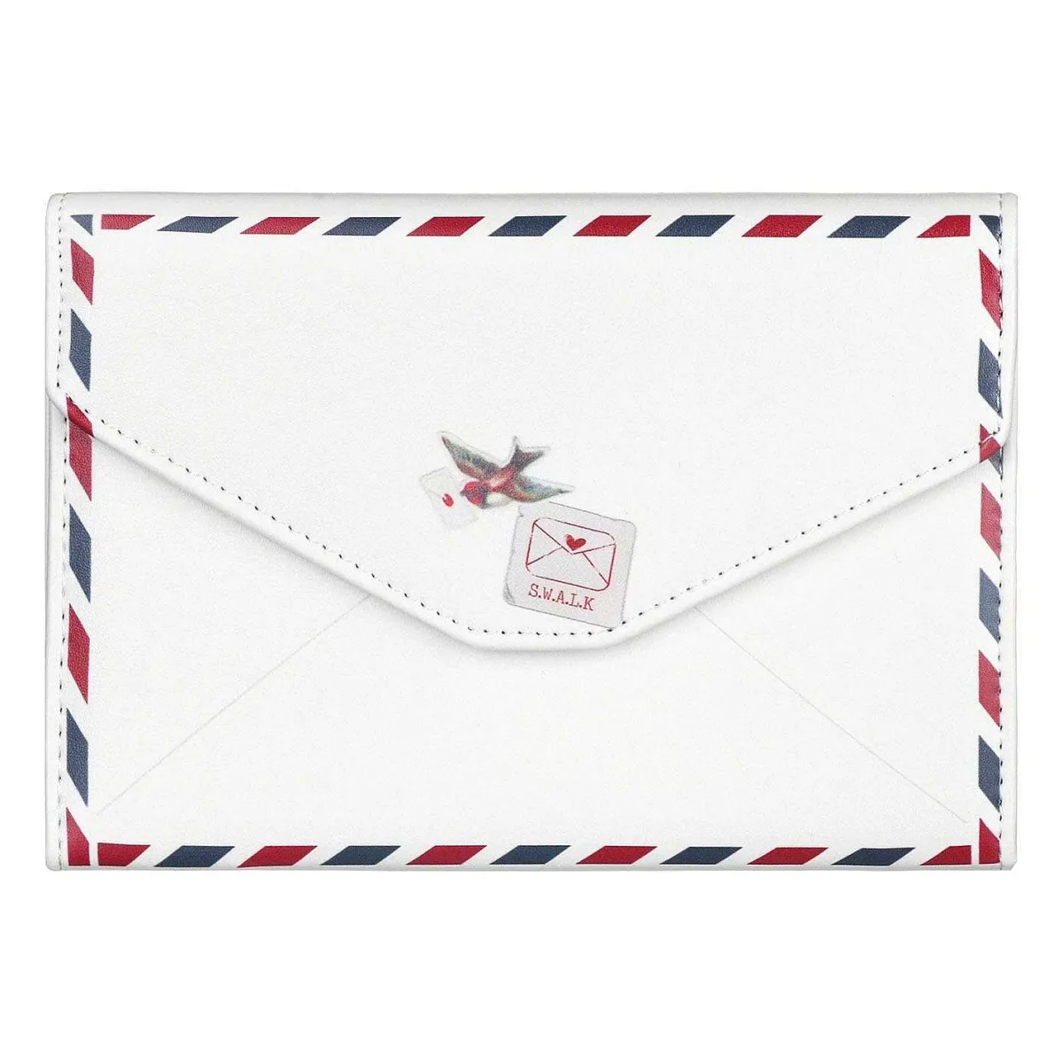 This Envelope Shaped Wallet Is Cream In Colour And Decorated With The Air Mail Red And Blue Stripes Around The Edges. On The Top Of The ‘Envelope’ Flap There Is A Small Stitched On Cream Patch Which Has An Envelope With A Heart That Says ‘S.W.A.L.K’ (Sealed With A Loving Kiss’) Written On It – So Cute! Next To This Is A Patch Shaped Like A Swallow Which Is Holding A Letter With A Red Seal On It. Underneath This Is A Triangular Section That Has Navy Blue Spots On It And The Words ‘Ready To Go?’ And The Popper That Keeps The Wallet Safe And Secure.