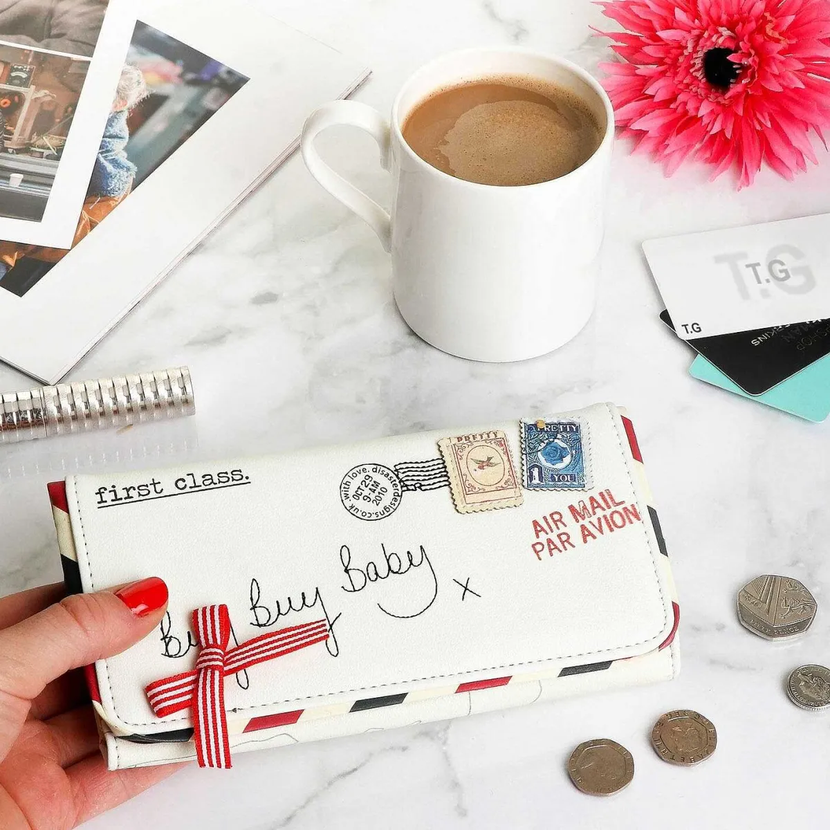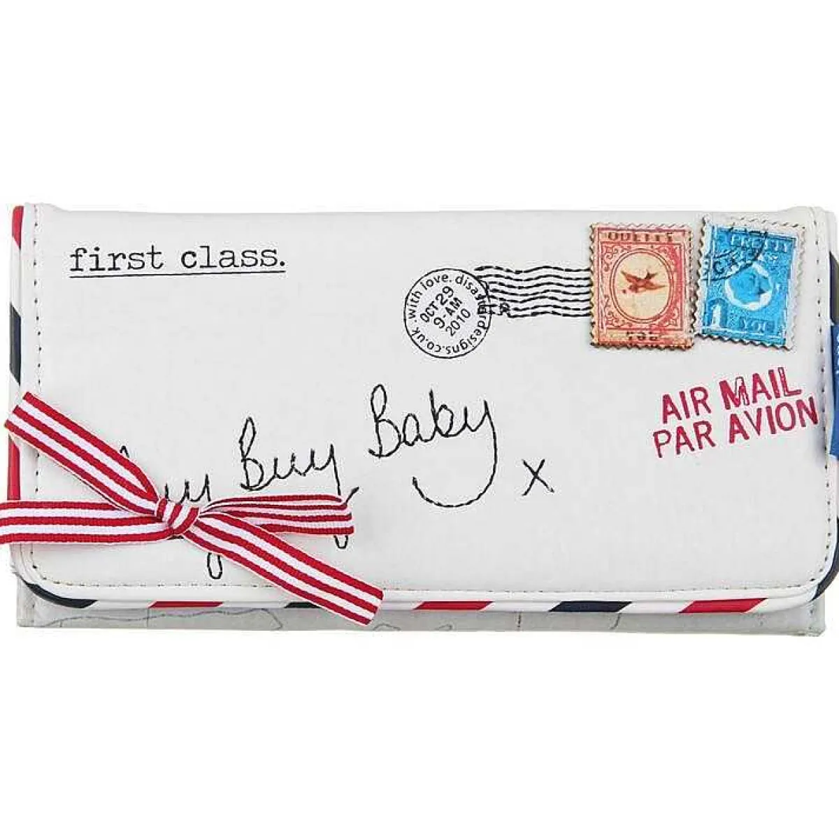 This Is A Beautiful Wallet From The Paper Plane Range. The Front Of The Wallet Features Two Stamps And A Red And White Striped Bow As Embellishment With The Text ‘First Class’ ‘Buy Buy Baby’ And ‘Air Mail Par Avion’. This All Adds To The Wonderful Style Of An Air Mail Letter And Even Has The Blue, Cream And Red Edging Around The Outside!