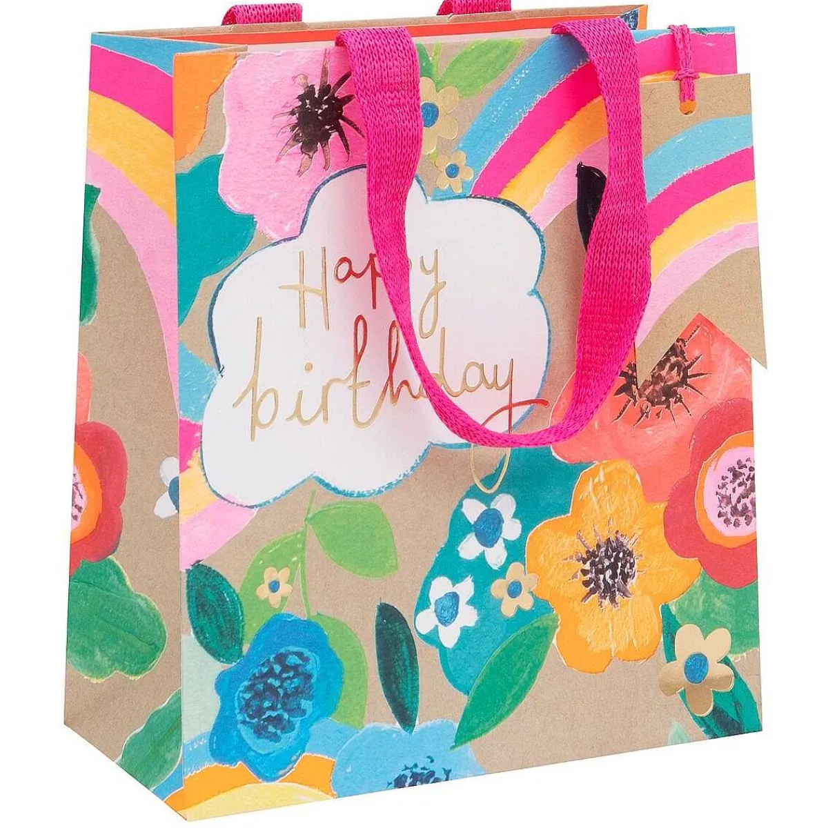 The Design Features Rainbows And Flowers, Set Against A Simple Brown Background. There Is A White Cloud At The End Of One Rainbow With Gold Foiled Text Inside That Reads ‘Happy Birthday’. This Gift Bag Features Bright Pink Woven Paper Handles And Comes With A Matching Gift Tag For You To Add Your Own Personalised Message To The Recipient.