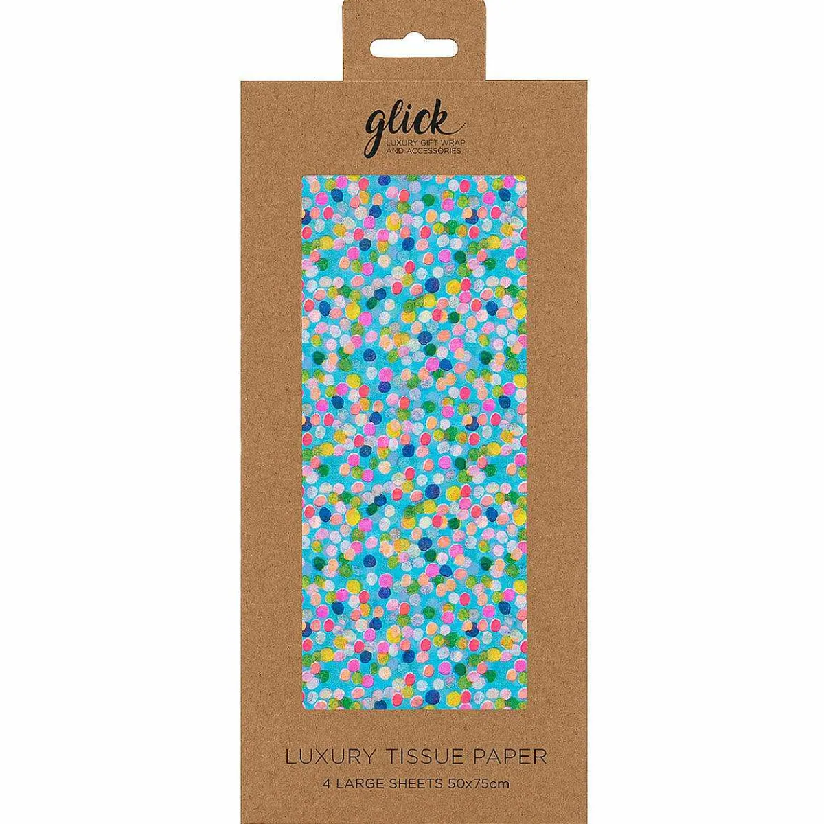 Wrap A Gift In Beautiful Tissue With This Stunning And Colourful Spotty Blue Tissue Paper From The Paper Salad Range By Glick. This Gorgeous Tissue Paper Is Decorated With A Pattern Of Splattered Dots In Colours Of Navy, Green, White, Yellow, Pink And More, Scattered Across A Bright Blue Background.