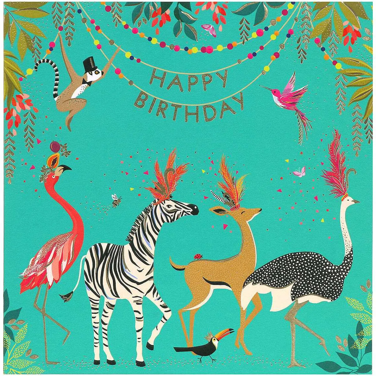 This Large Gold Foiled Greetings Card From Sara Miller Depicts A Parade Of Exotic Animals Such As A Zebra, A Flamingo, And A Lemur, Wearing Colourful Headdresses. These Playful Creatures Are Surrounded By Some Lush Tropical Vegetation On A Vibrant Green Background. Shimmering Gold Foil Is Used Around The Card Which Adds A Luxurious Touch To The Design.
