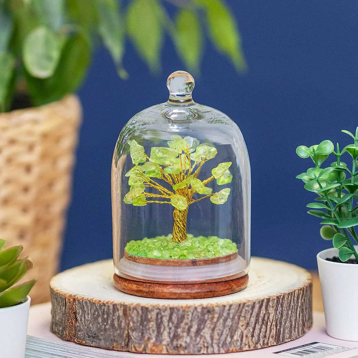 Made From Peridot Crystals, This Tree-Shaped Ornament Is The Perfect Good Luck Charm. The Tree Is Presented Beautifully Within A Glass Dome Which Will Look Beautiful Displayed In Your Home And Creates A Tranquil Atmosphere In Your Living Space.