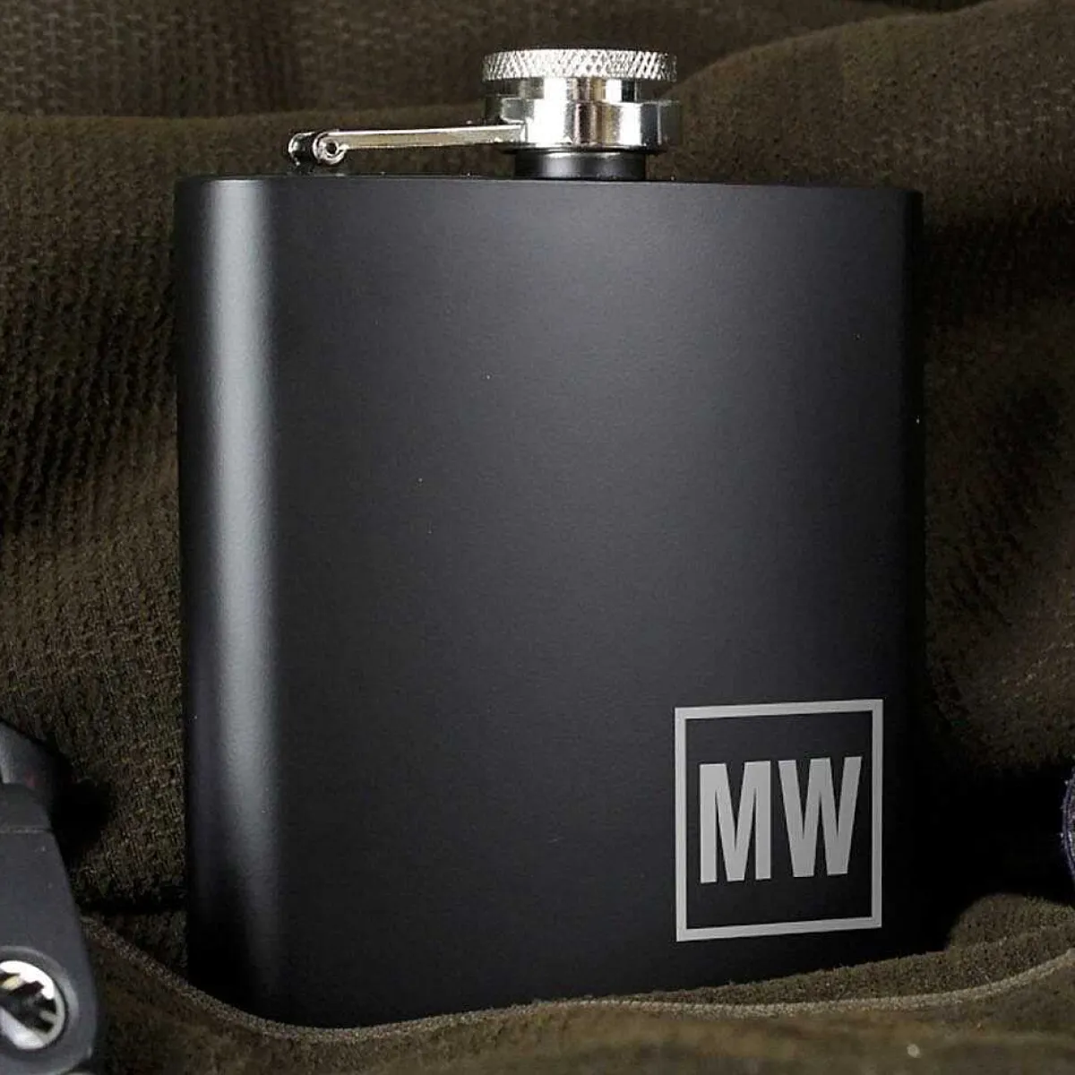Made From Stainless Steel, It Has A Matte, Black Finish And A Hinged Lid That Screws On Securely. The Front Features A Silver Engraved Square In The Bottom Corner, Within Which You Can Personalise With Up To Two Initials Of Your Choice.