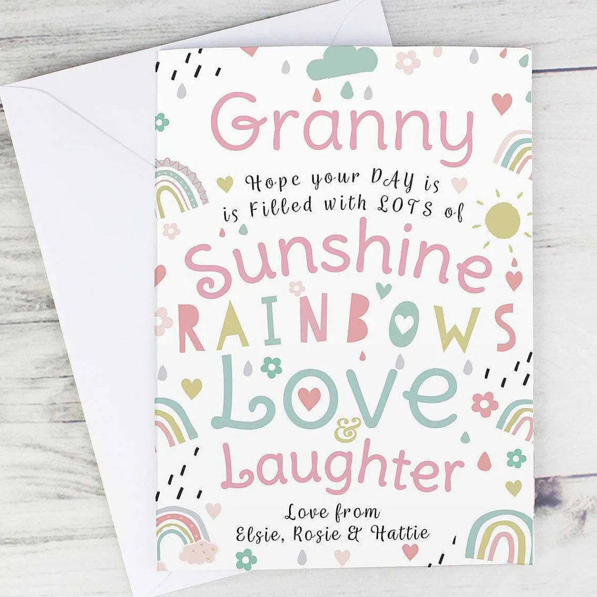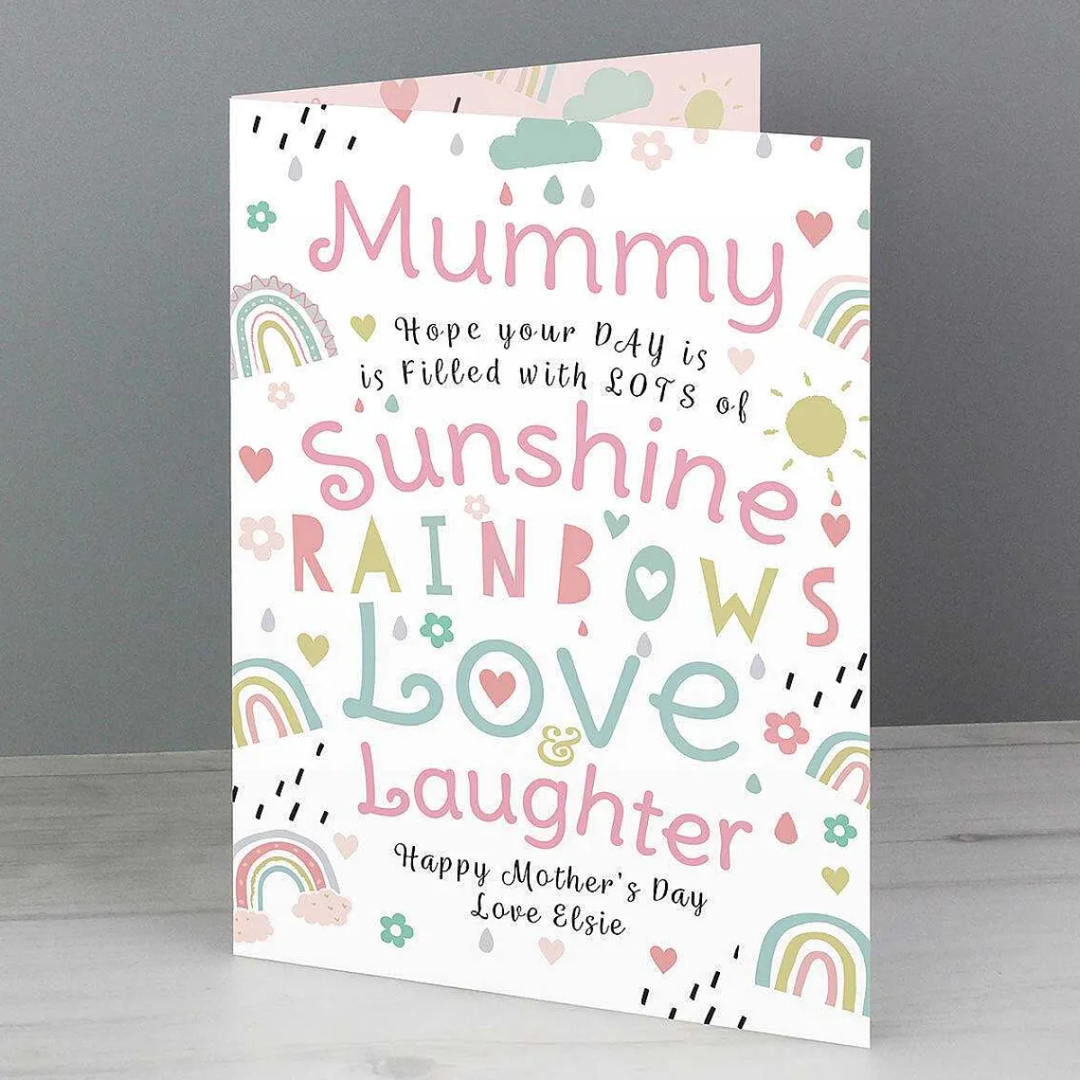 Featuring Colourful Writing And Illustrations Of Rainbows, Clouds And The Sunshine. This Card Has Personalisable Text On The Front And On The Inside!