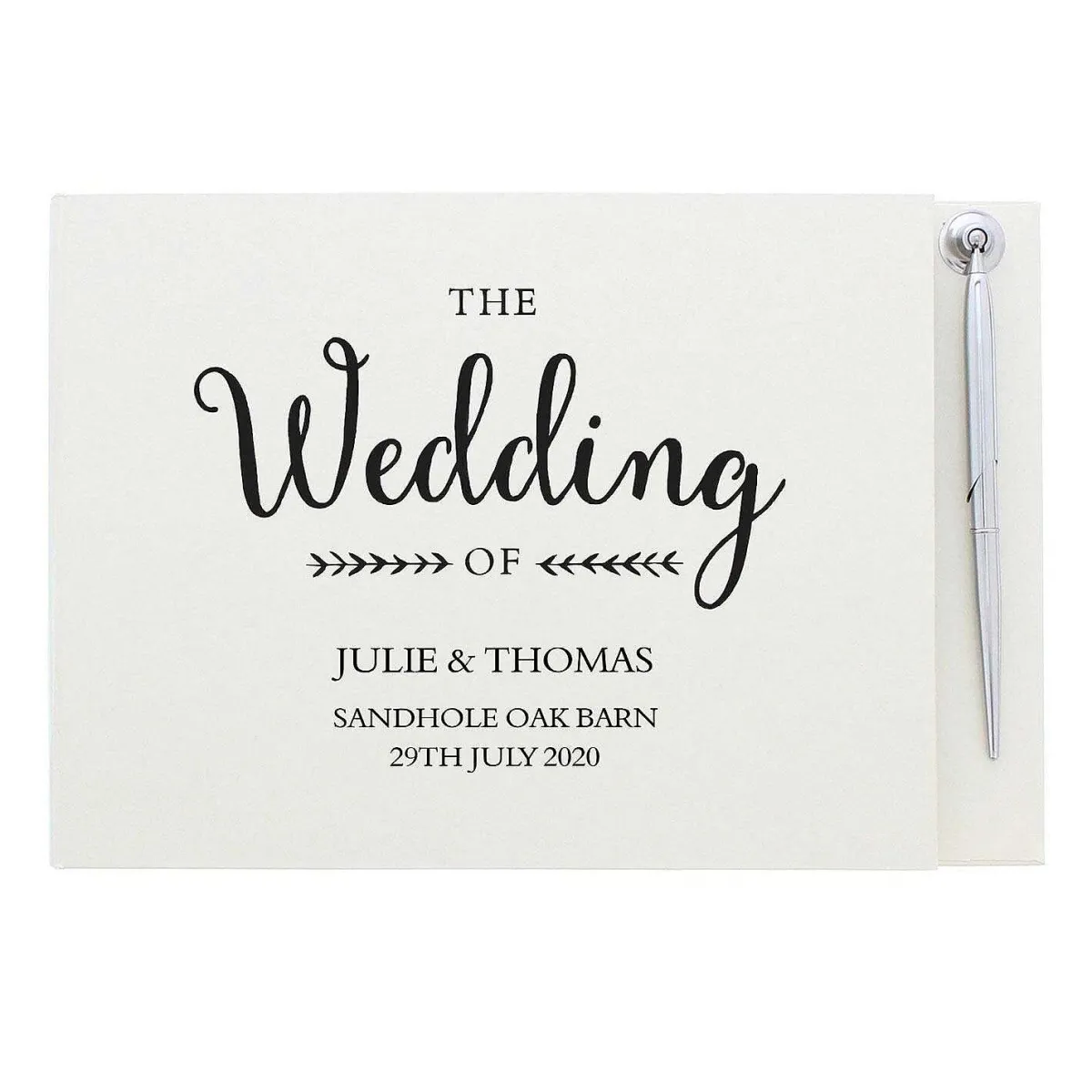 Cream In Colour, The Front Cover Has A Soft, Linen Texture And Features The Phrase, ‘The Wedding Of’ In A Mix Of Cursive And Capitalise Lettering (Please Note That This Is Fixed And Cannot Be Amended). Underneath This Is Space To Personalise It With Up To Three Lines Of Text. There Are Approximately 30 Sheets Of High Quality Paper Inside To Allow Guests To Leave Well Wishes, Notes And Funny Anecdotes For The Bride And Groom. The Back Cover Is Slightly Wider Than The Front And Features A Silver, Ball Point Pen Which Is Attached Ensuring There Is Always A Pen For Your Guests To Use.